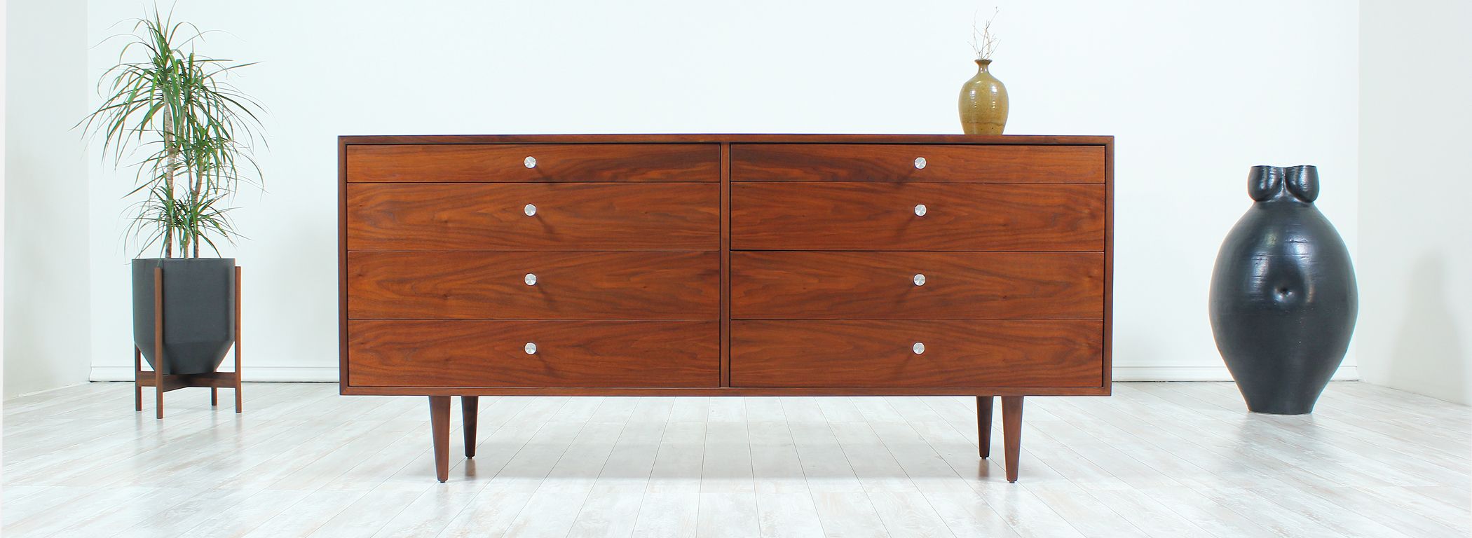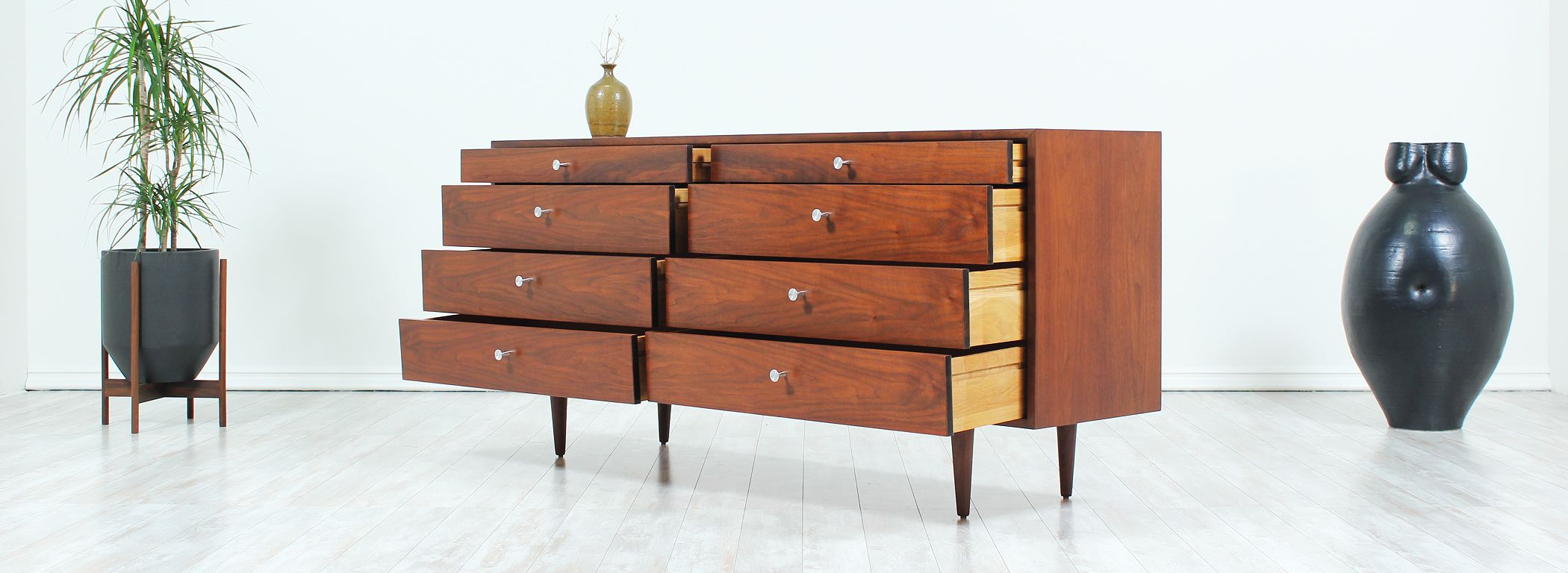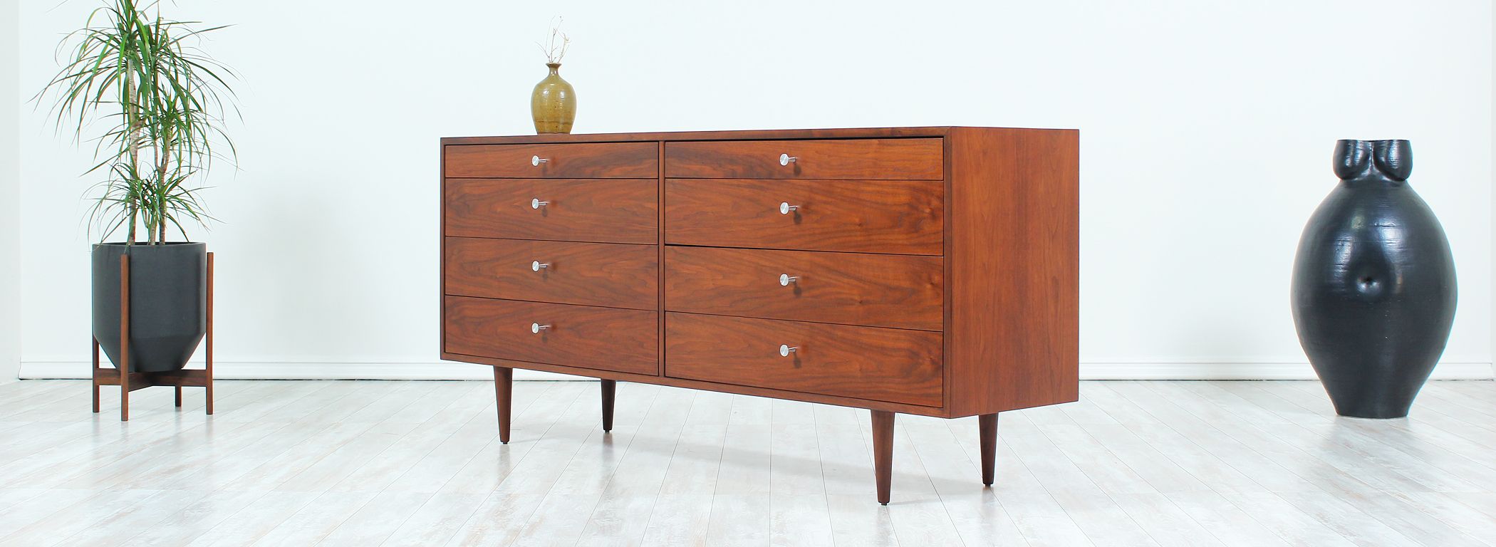 Mid Century modern dresser designed by Milo Baughman for Glenn of California in the United States circa 1950s. Newly refinished by our expert craftsmen, this spectacular eight-drawer dresser features a walnut-veneered case supported by tapered legs. The intricate bookmatched drawers feature metal pulls that contrast wonderfully with the warm brown tone. Its organic simplicity makes it a great addition to reflect modern elegance in any room.