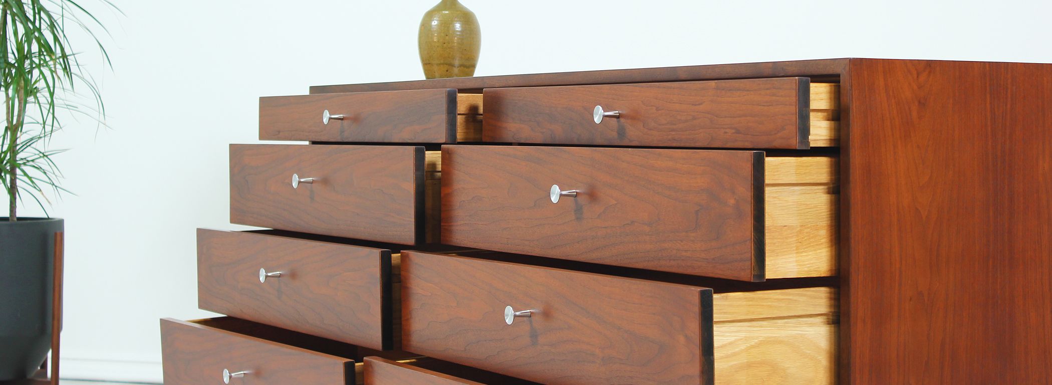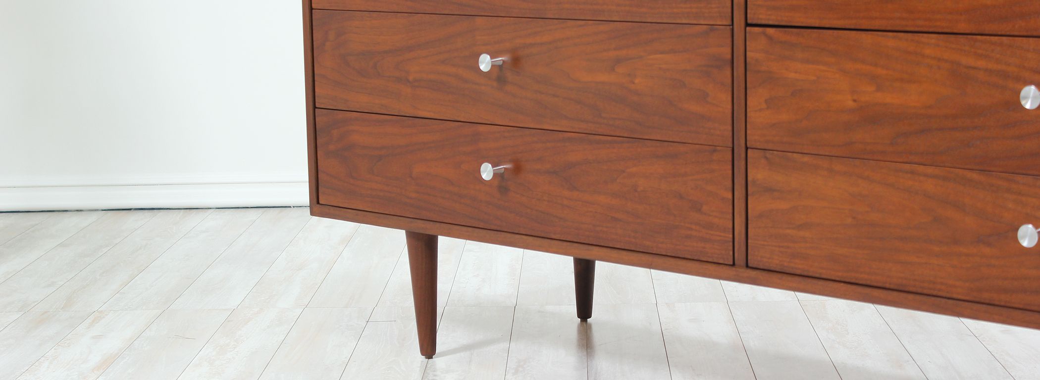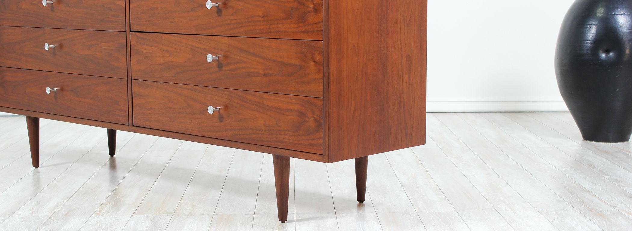 Mid Century modern dresser designed by Milo Baughman for Glenn of California in the United States circa 1950s. Newly refinished by our expert craftsmen, this spectacular eight-drawer dresser features a walnut-veneered case supported by tapered legs. The intricate bookmatched drawers feature metal pulls that contrast wonderfully with the warm brown tone. Its organic simplicity makes it a great addition to reflect modern elegance in any room.