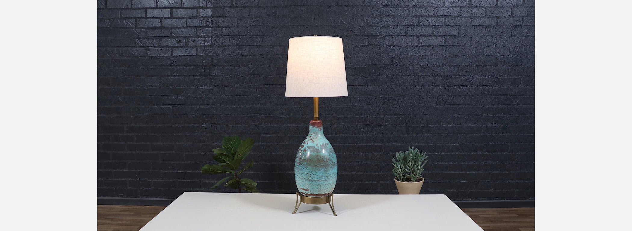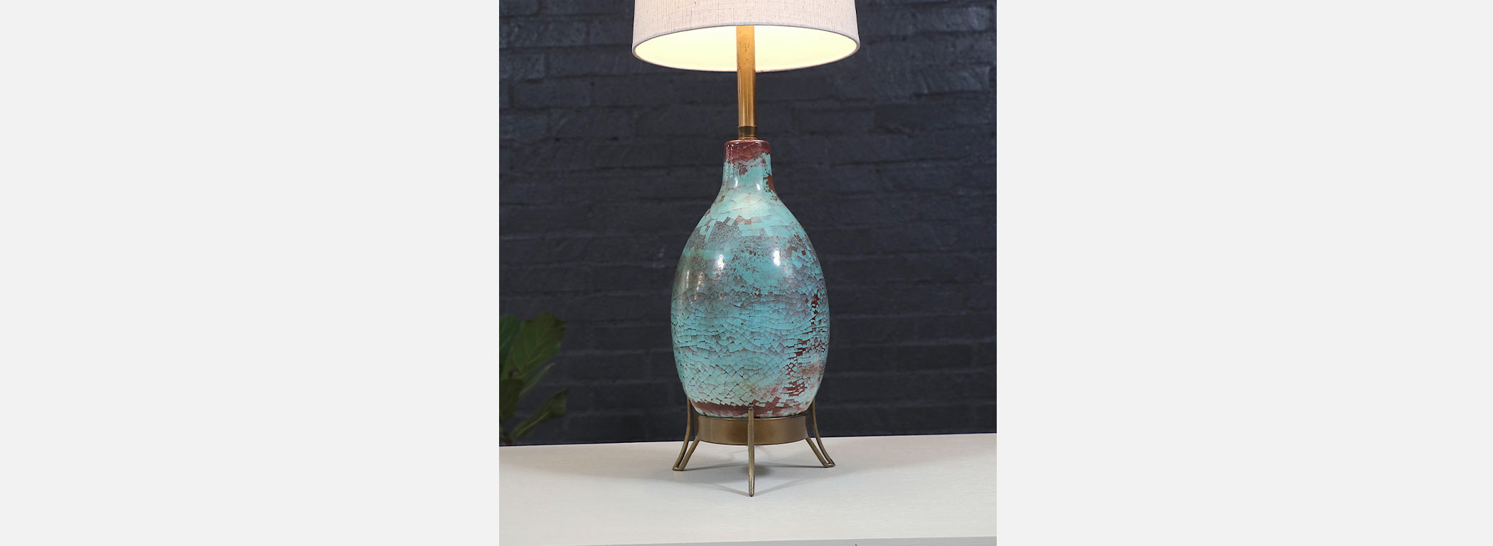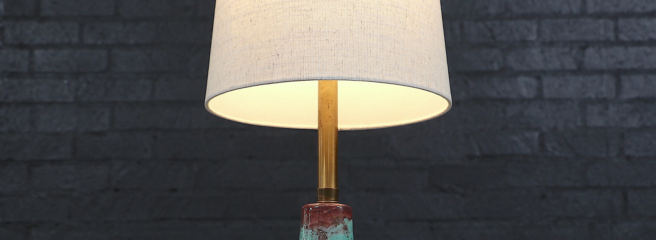This striking Mid-Century Modern table lamp by Marbro Lamp Co. is a statement piece that blends artistry with functionality. The lamp features a beautifully textured glazed ceramic base, exhibiting a mesmerizing crackled finish in an eye-catching mix of turquoise and burnt red. Elevated by a sculptural brass stand, the lamp is further accented by a sleek brass neck and a newly added linen shade, enhancing its timeless appeal. A remarkable addition to any vintage or modern interior, this lamp is a conversation starter that brings both warmth and character to any space.