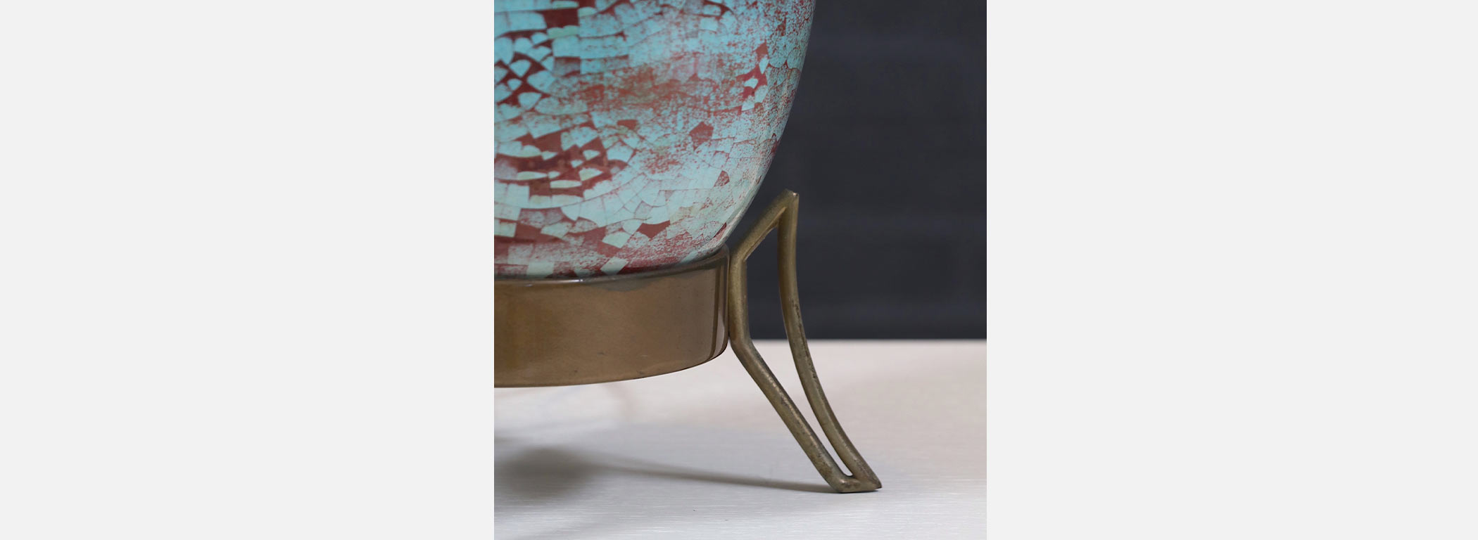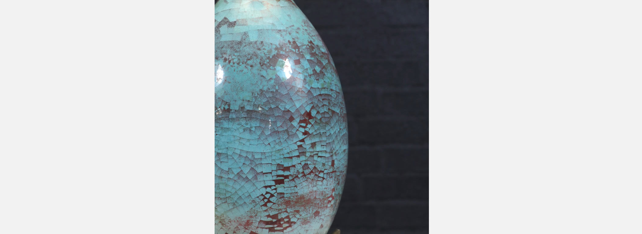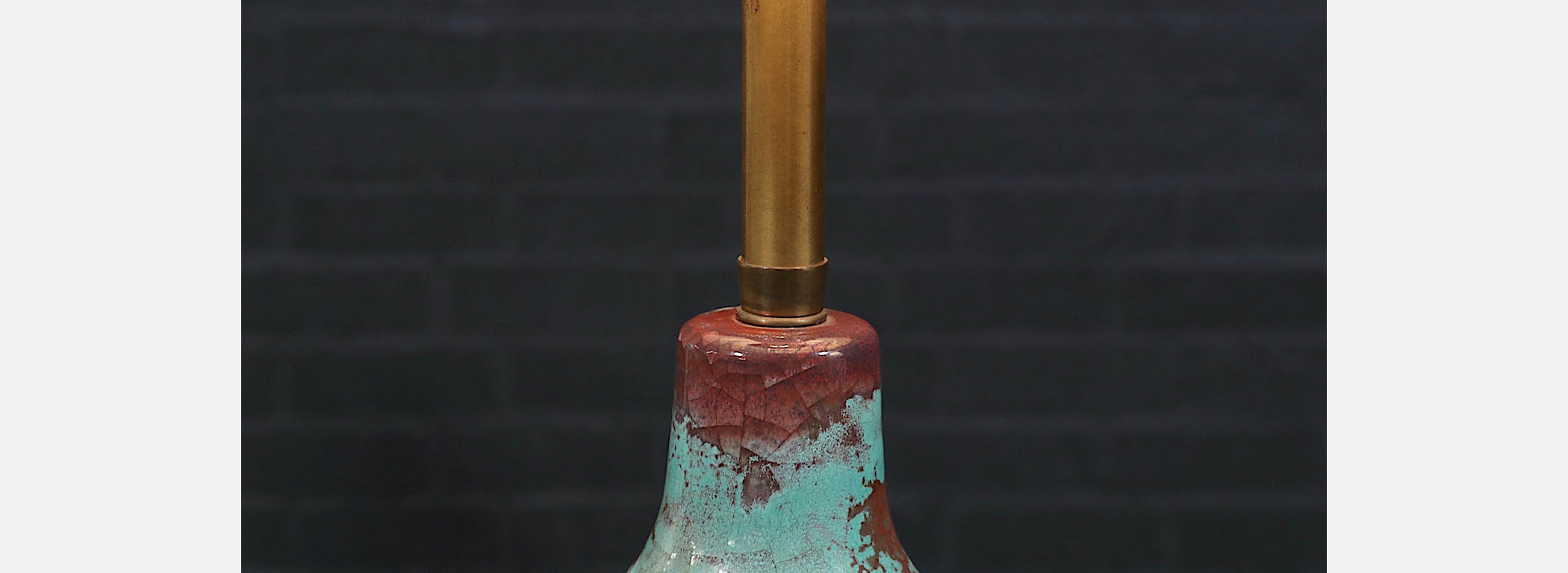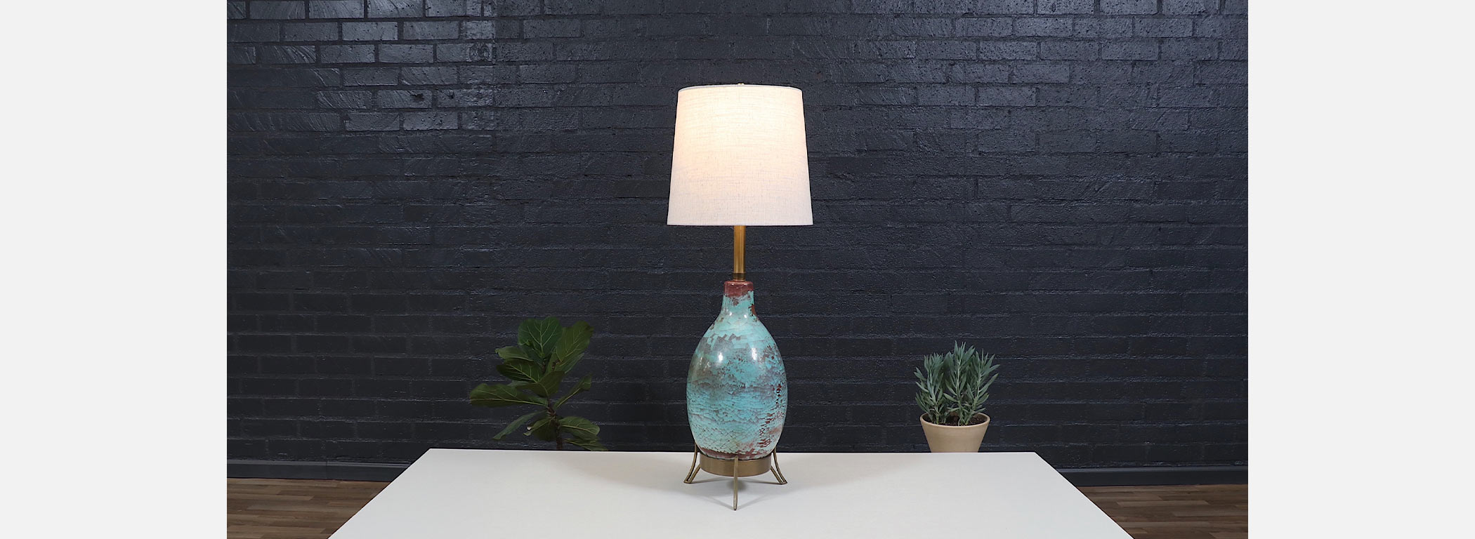 This striking Mid-Century Modern table lamp by Marbro Lamp Co. is a statement piece that blends artistry with functionality. The lamp features a beautifully textured glazed ceramic base, exhibiting a mesmerizing crackled finish in an eye-catching mix of turquoise and burnt red. Elevated by a sculptural brass stand, the lamp is further accented by a sleek brass neck and a newly added linen shade, enhancing its timeless appeal. A remarkable addition to any vintage or modern interior, this lamp is a conversation starter that brings both warmth and character to any space.