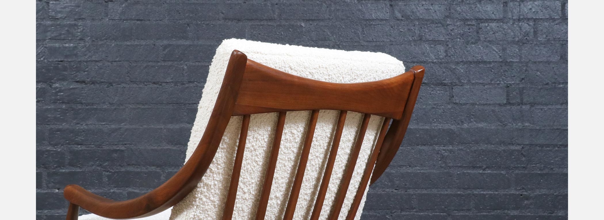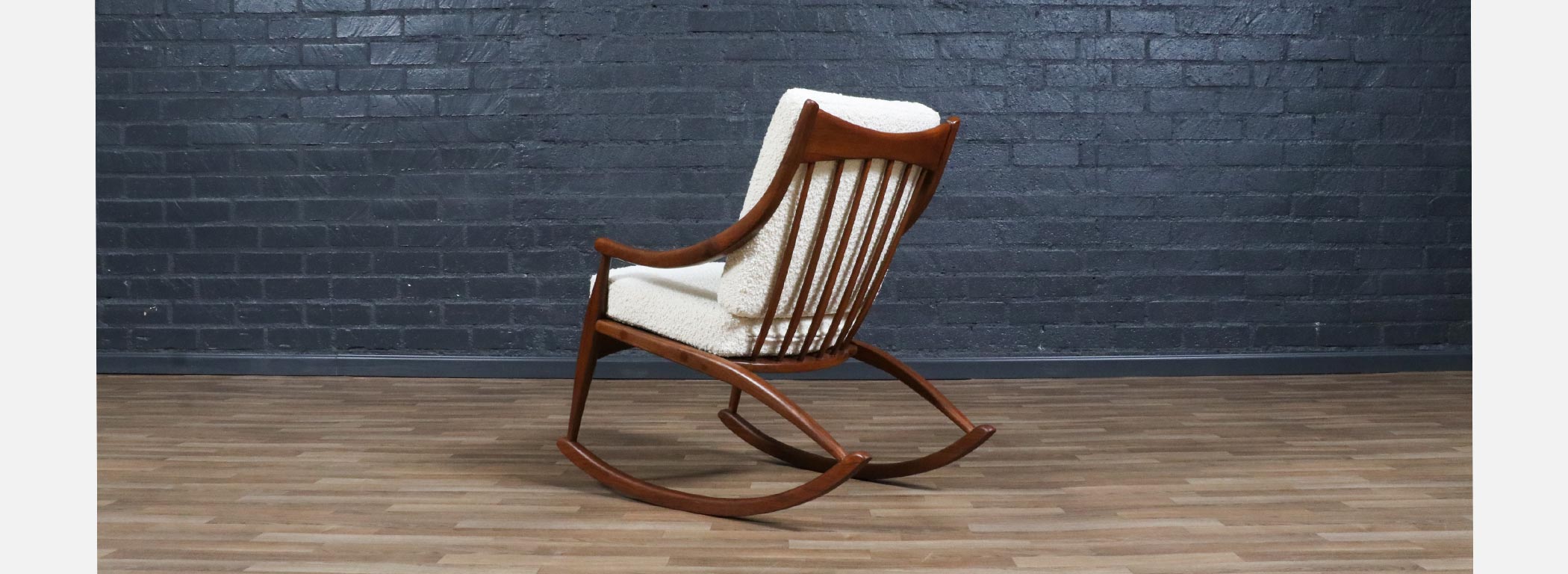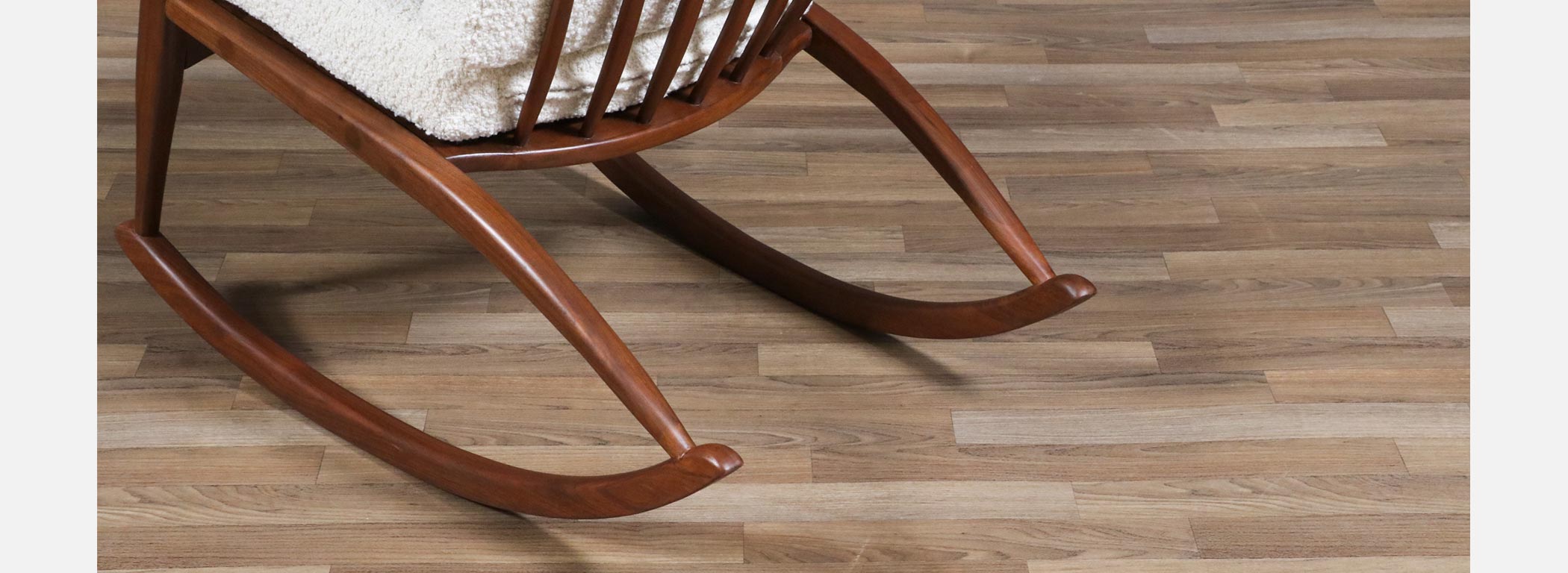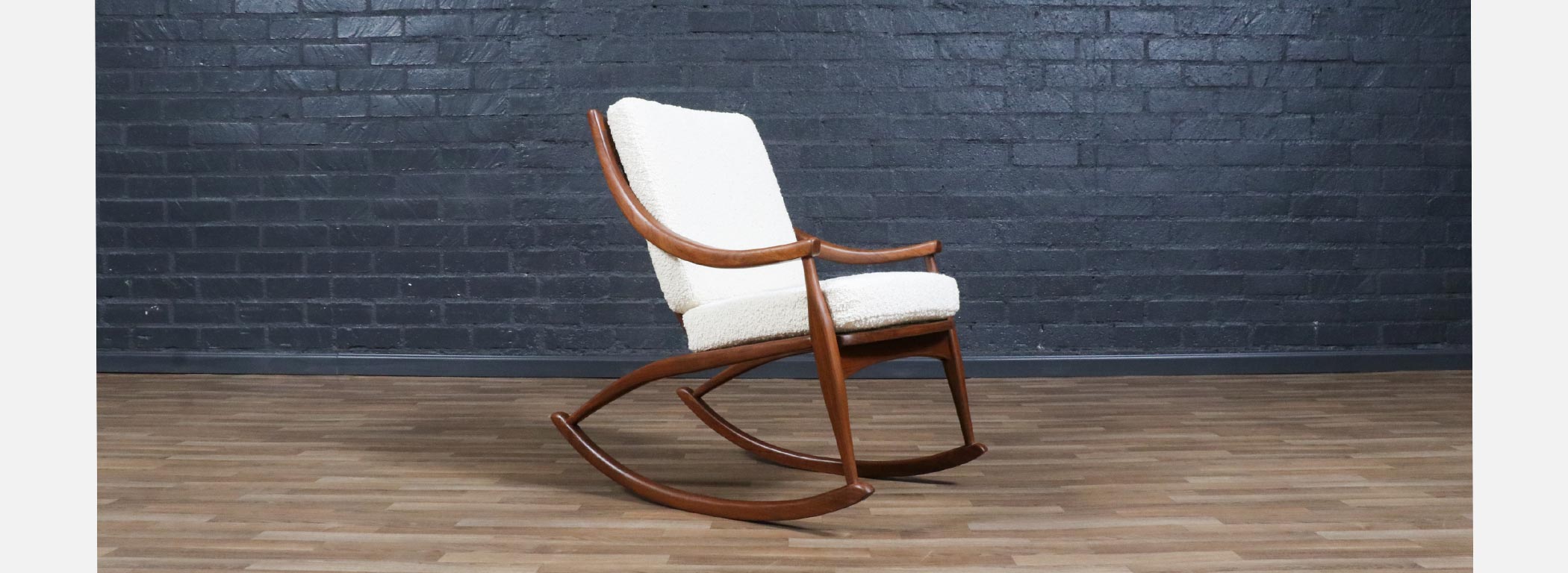 In the mid-20th century, designers increasingly explored the idea that furniture should move with people, not just sit in a space, leading to iconic rocking chairs that blended sculptural form with physical comfort. Walnut was a favored wood for these pieces because its strong yet graceful grain allowed designers to carve fluid, organic shapes without sacrificing structural integrity. Boucle upholstery became popular in later decades for its soft texture and ability to complement the natural warmth of wood, creating a tactile contrast that enhanced the sensory experience of furniture. Rocking chairs from this era reflect a broader cultural shift toward relaxed, human-scaled interiors where comfort and design were held in equal esteem.