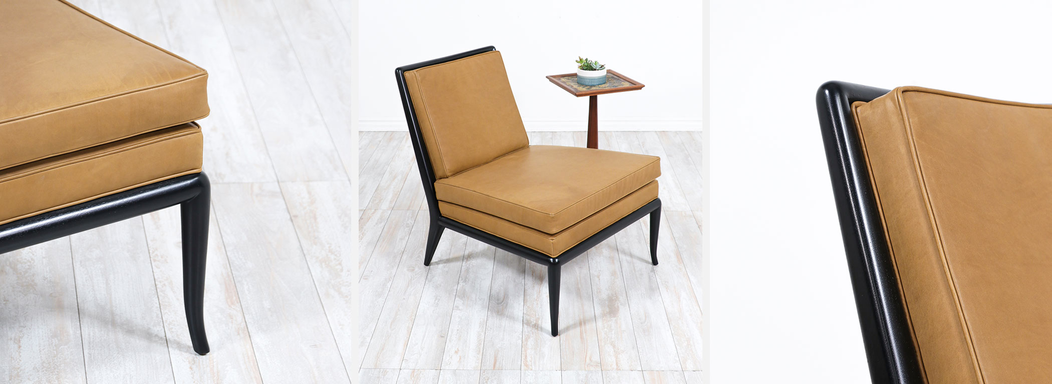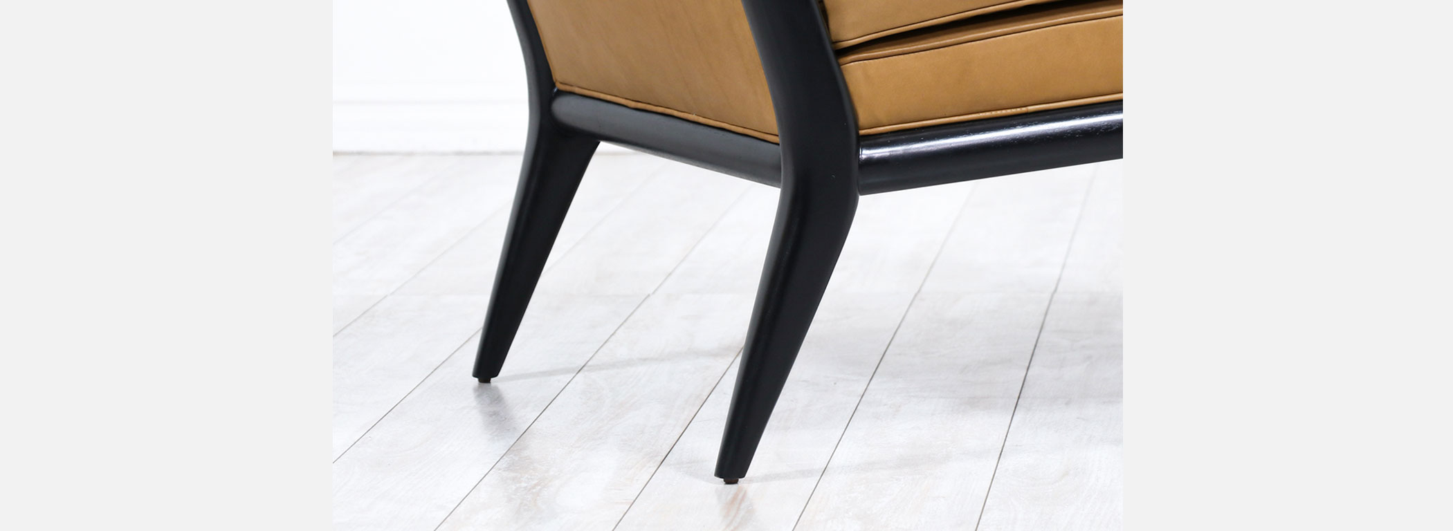 Introducing the T.H. Robsjohn-Gibbings Leather & Ebonized Wood Slipper Lounge Chairs for Widdicomb, a vintage gem exuding timeless grace. Crafted in the 1950s in the United States, these chairs epitomize the era’s exceptional craftsmanship.Meticulously restored, the ebonized wood frame now boasts a rich black finish that enhances the clean lines and sleek silhouette, capturing their modern design essence. Complementing the wood frame, new Italian full-grain leather upholstery in a rich brown hue adds luxury, while new high-density foam ensures optimum lounging comfort.T.H. Robsjohn-Gibbings, the iconic designer and maker of these chairs, played a significant role in shaping the mid-century modern design movement. Known for simplicity, clean lines, and timeless appeal, his designs remain highly sought after by collectors and design enthusiasts worldwide.Immerse yourself in Mid-Century Modern allure with the T.H. Robsjohn-Gibbings lounge chairs. With exceptional craftsmanship, luxurious materials, and a timeless aesthetic, these chairs make a perfect addition to any vintage or contemporary interior, offering the sophistication and comfort of a bygone era.