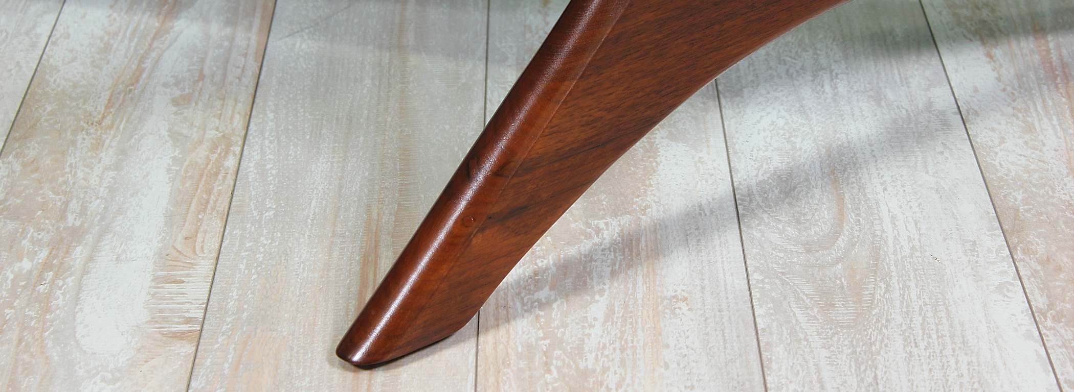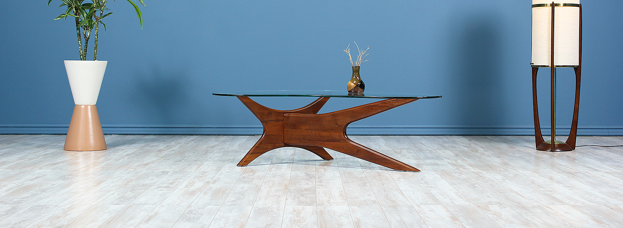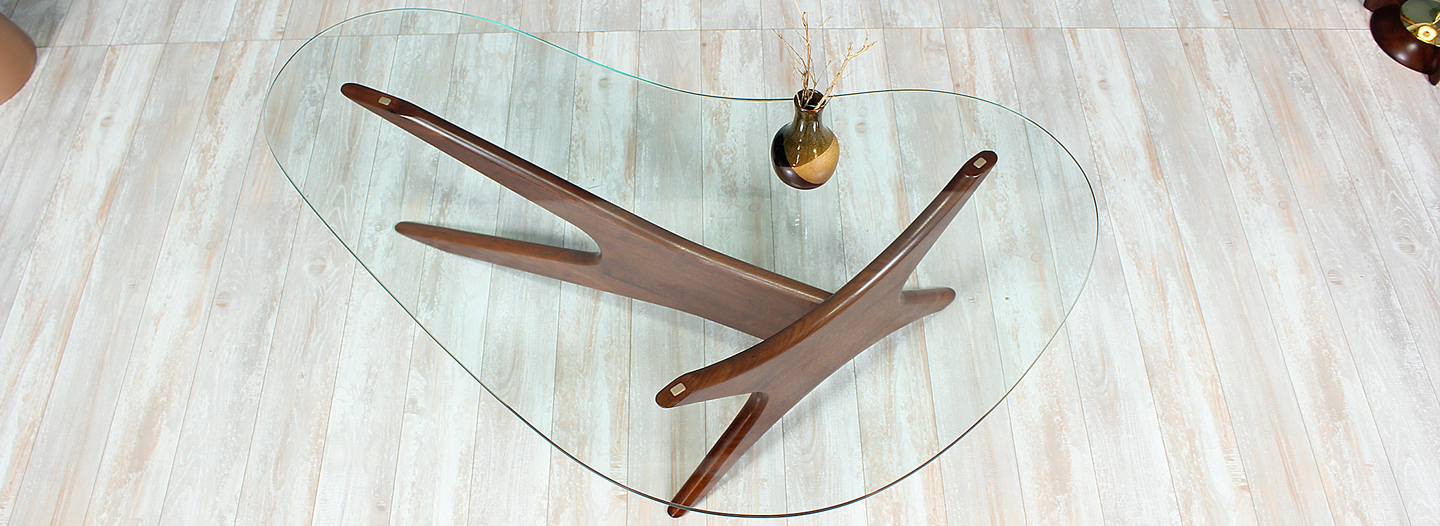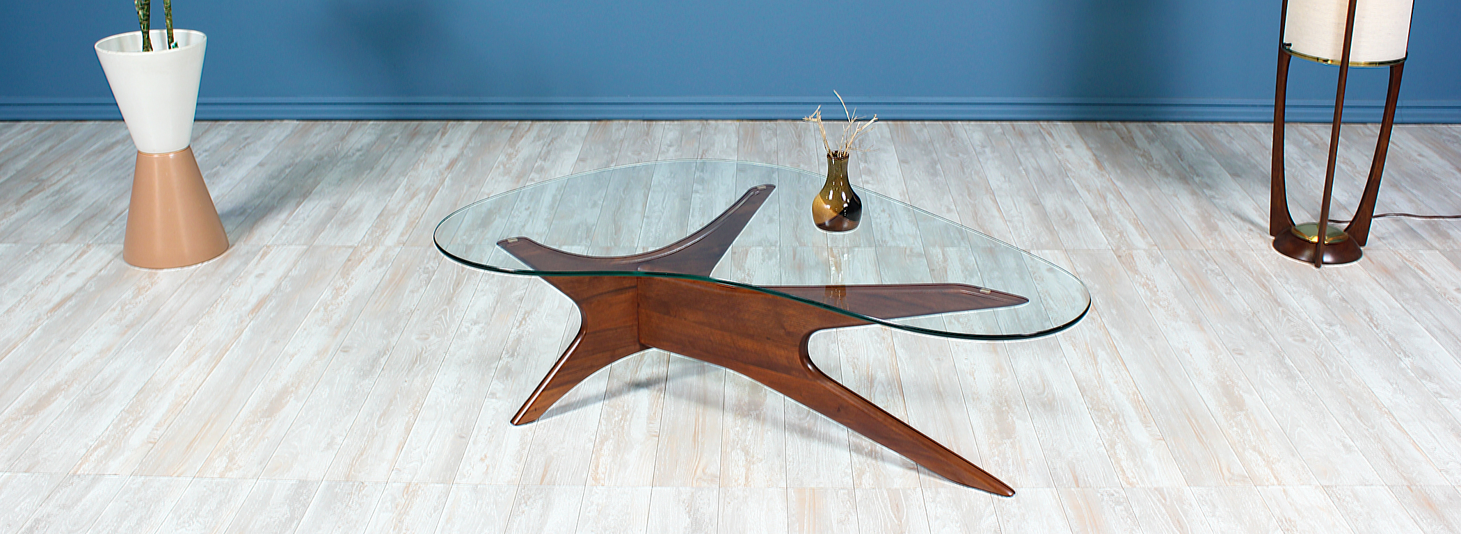 Model 1465-T coffee table designed by Adrian Pearsall for Craft Associates circa 1960’s. Like many of Pearsall’s designs, this coffee table incorporates the fun and sophisticated shapes popularized by the designer. Features include a solid sculpted walnut wood base with arched arms that support the kidney-shaped glass top. This coffee table has been refinished to match its walnut wood tone and the original glass is in mint condition. This unique design is a great addition to any home interior or office space for a mid-century modern feel.