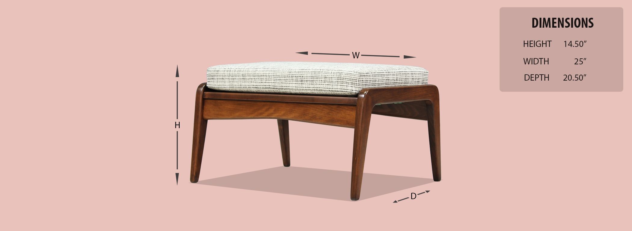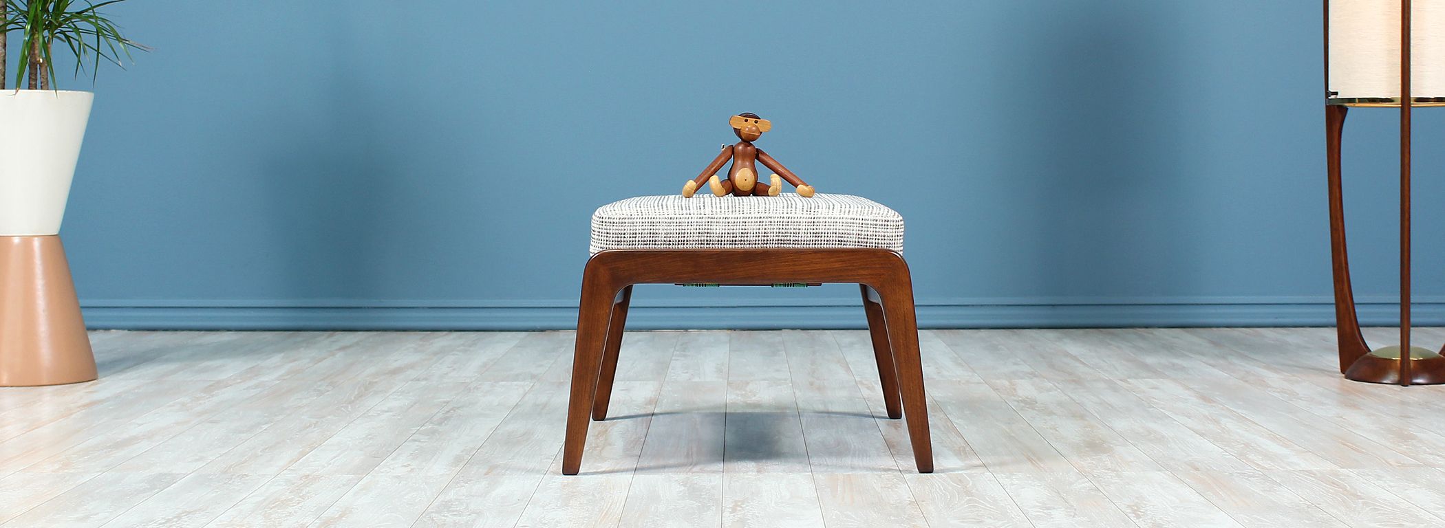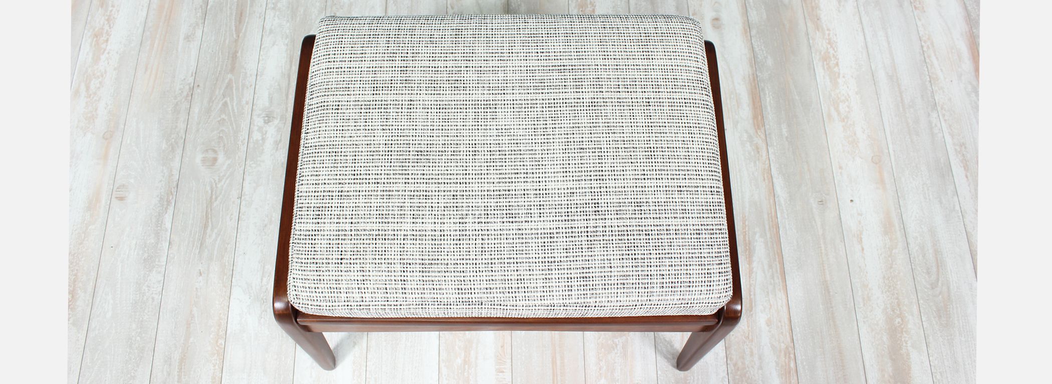 A beautiful stool or ottoman designed by Ib Kofod-Larsen for Selig in Denmark circa 1960’s. This compact and versatile piece features a solid walnut-stained beech wood frame and a comfortable new foam cushion upholstered with a textured grey tweed fabric. The sculptural wood base is in excellent, refinished condition. It can be used as a vanity stool, additional seating, or an ottoman to rest your legs.