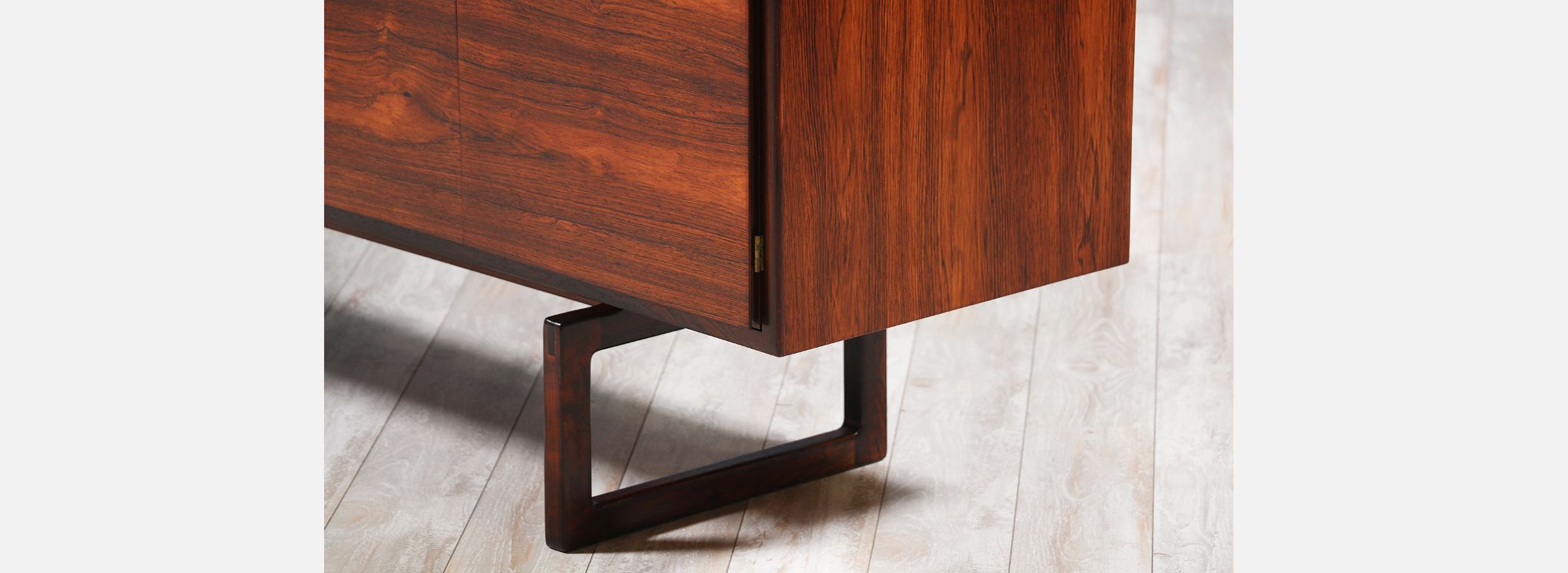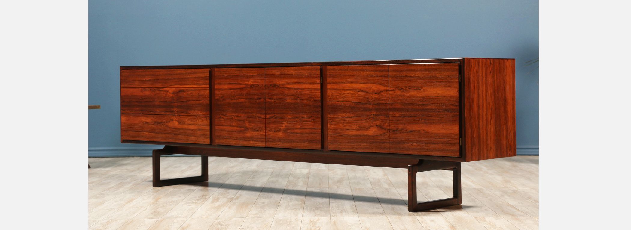 Rosewood credenza designed by Arne Hovmand-Olsen for Mogens Kold Møbelfabrik in Denmark circa 1950’s. Constructed with Brazilian rosewood, this elegant and minimalistic design features intricate grain patterns throughout. Two shelved compartments lay behind two sets of doors on the right while the left has three dovetailed drawers with hidden grooves for functionality. The case sits on a geometric sled base. Maintains the manufacturers tag.