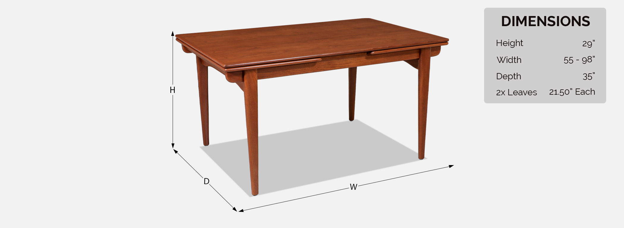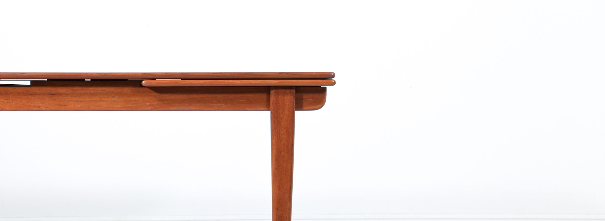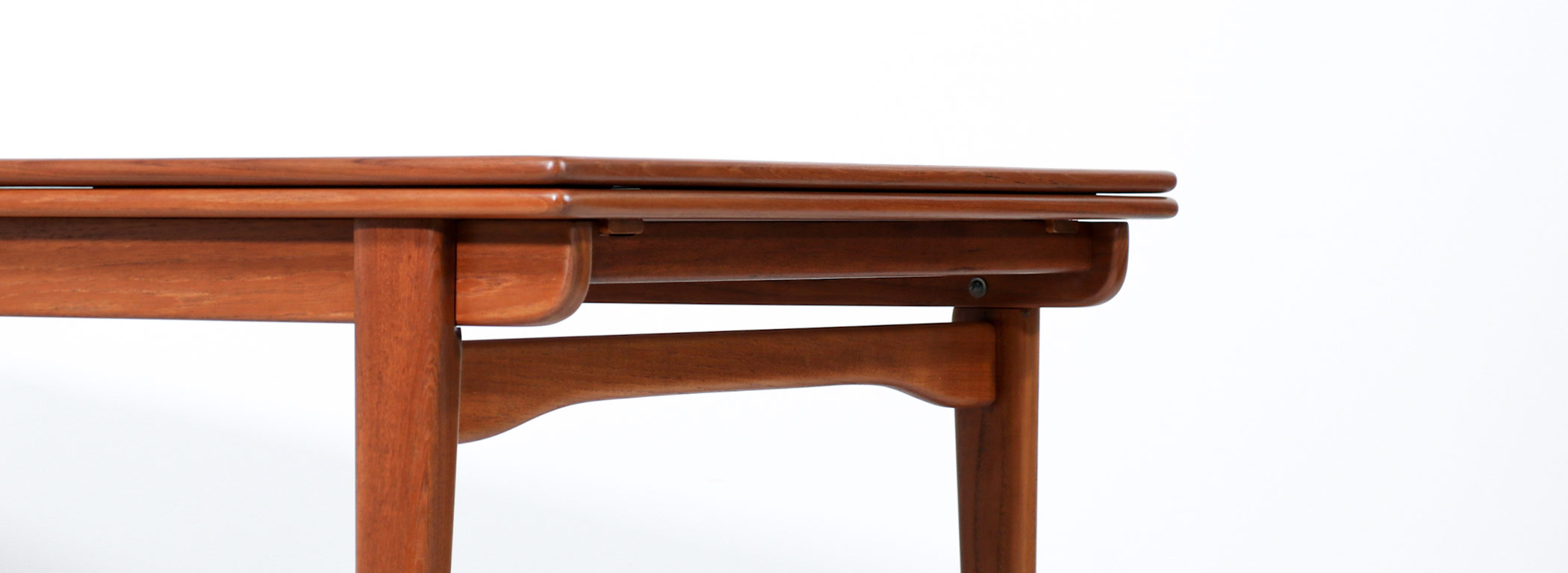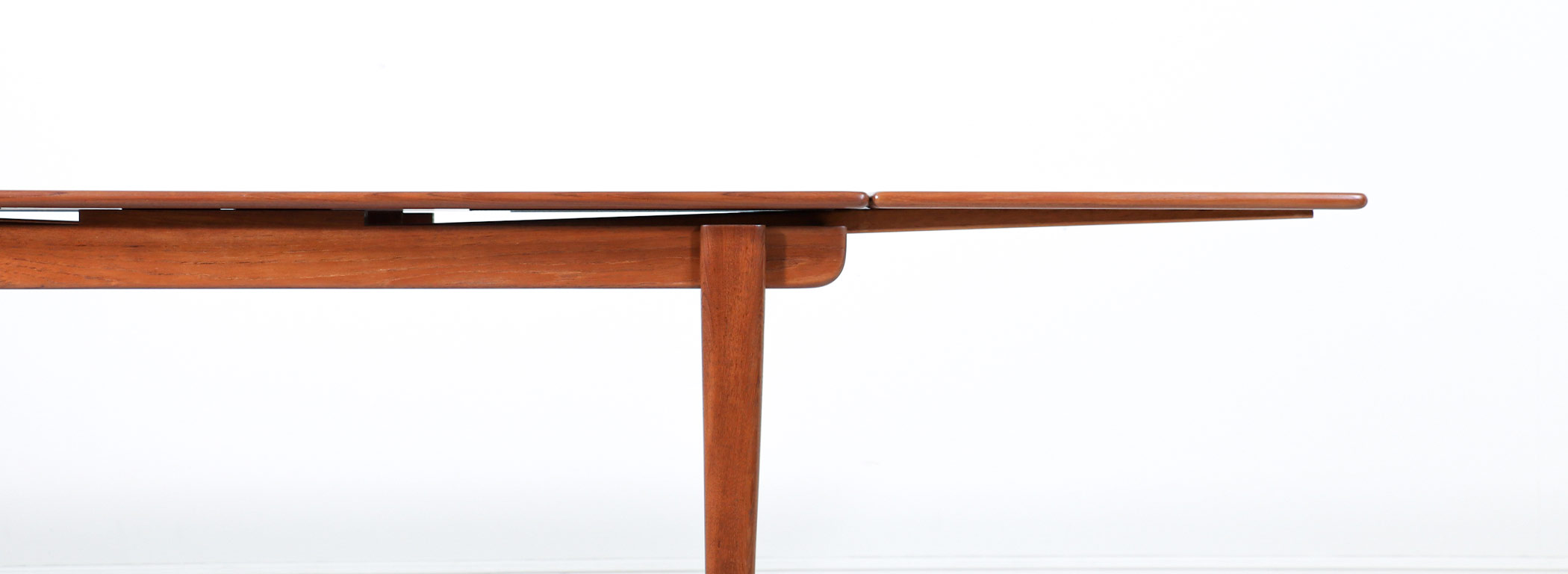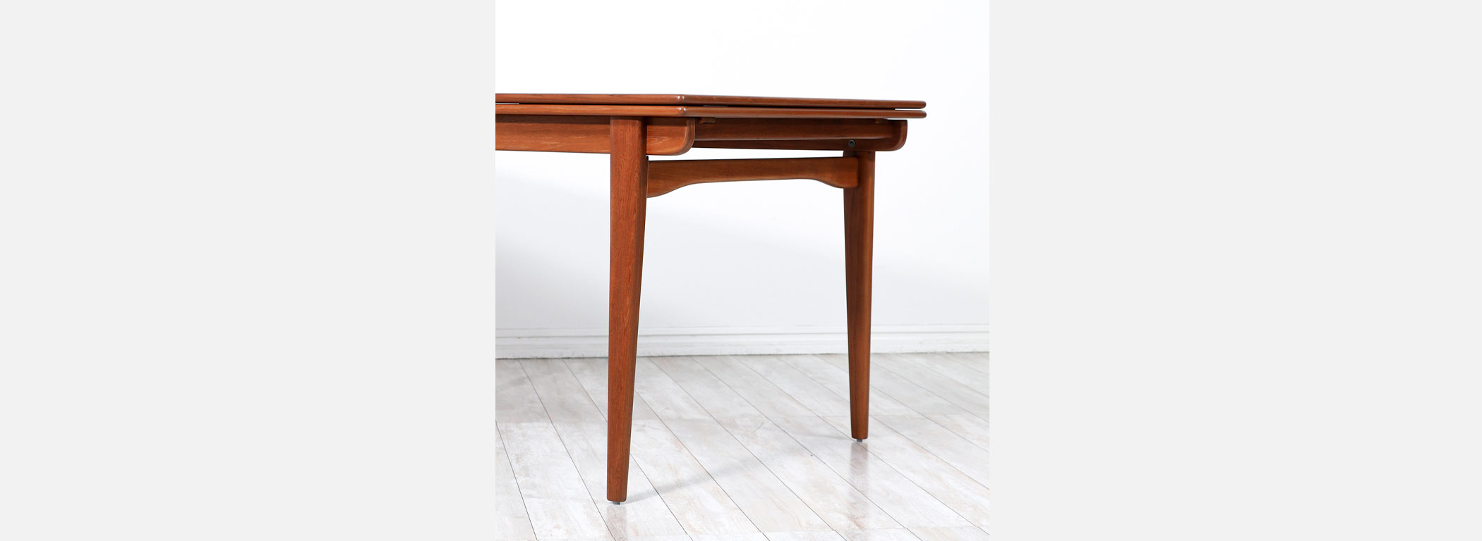 Stylish Danish Modern draw-leaf dining table by Danish furniture designer Johannes Andersen and manufactured by the workshop of Uldum Møbelfabrik, circa 1960s. This versatile table design features a solid teak wood body with a rectangular top and angled tapered legs for a minimalist and clean modern look. This timeless design feature two leaves that store underneath the main tabletop that pull out when needed to expand. The table has been professionally refinished by our expert craftsmen keeping the original warm hue to complement any modern interior and reflect its organic simplicity throughout. The table extends in length to 98” to comfortably accommodate guests when needed.