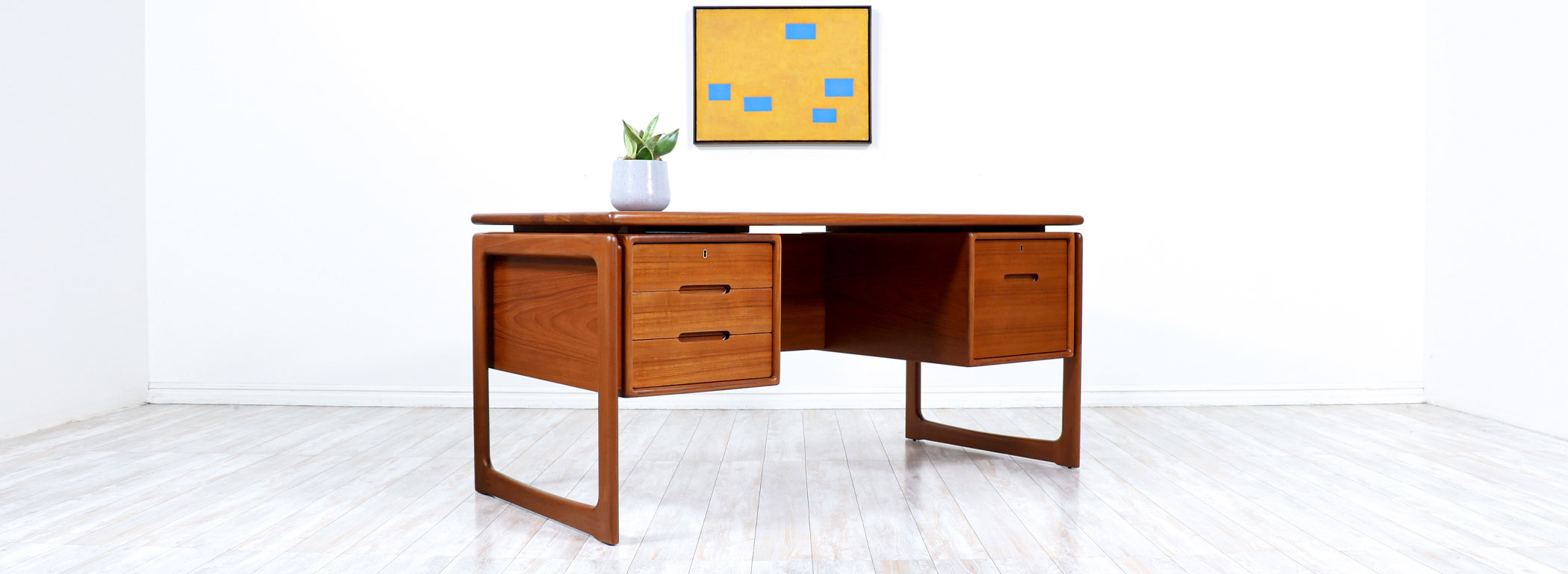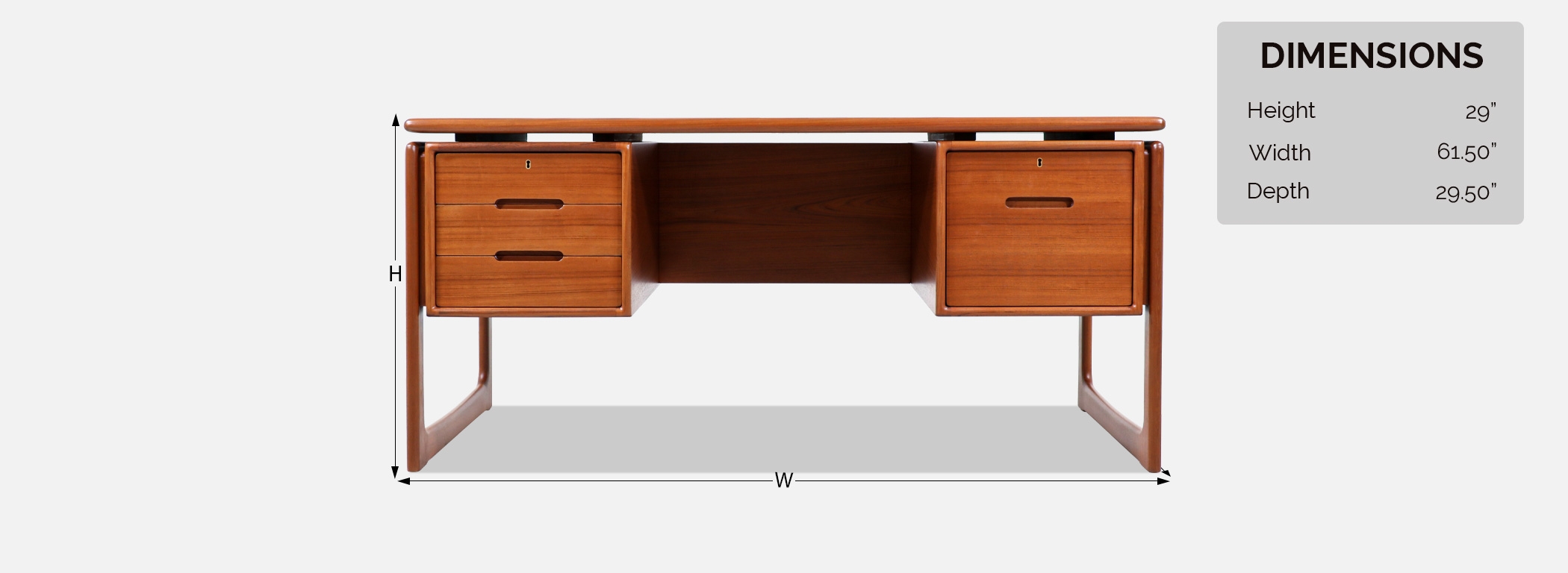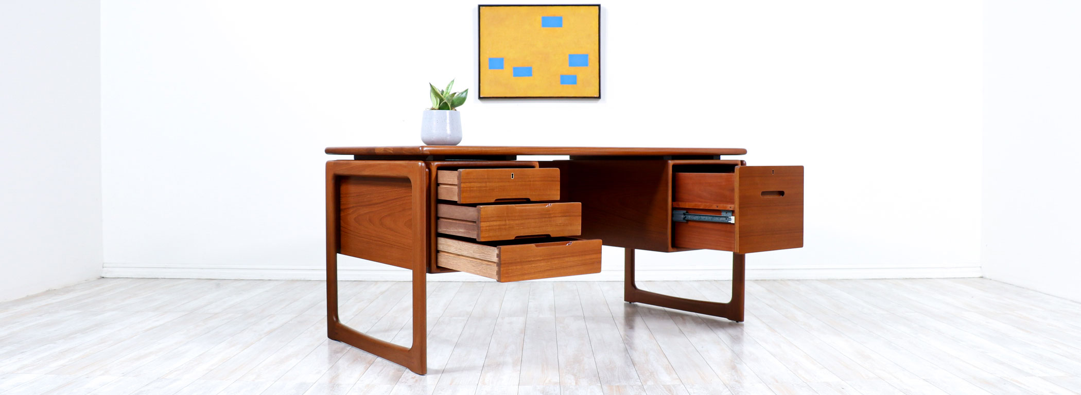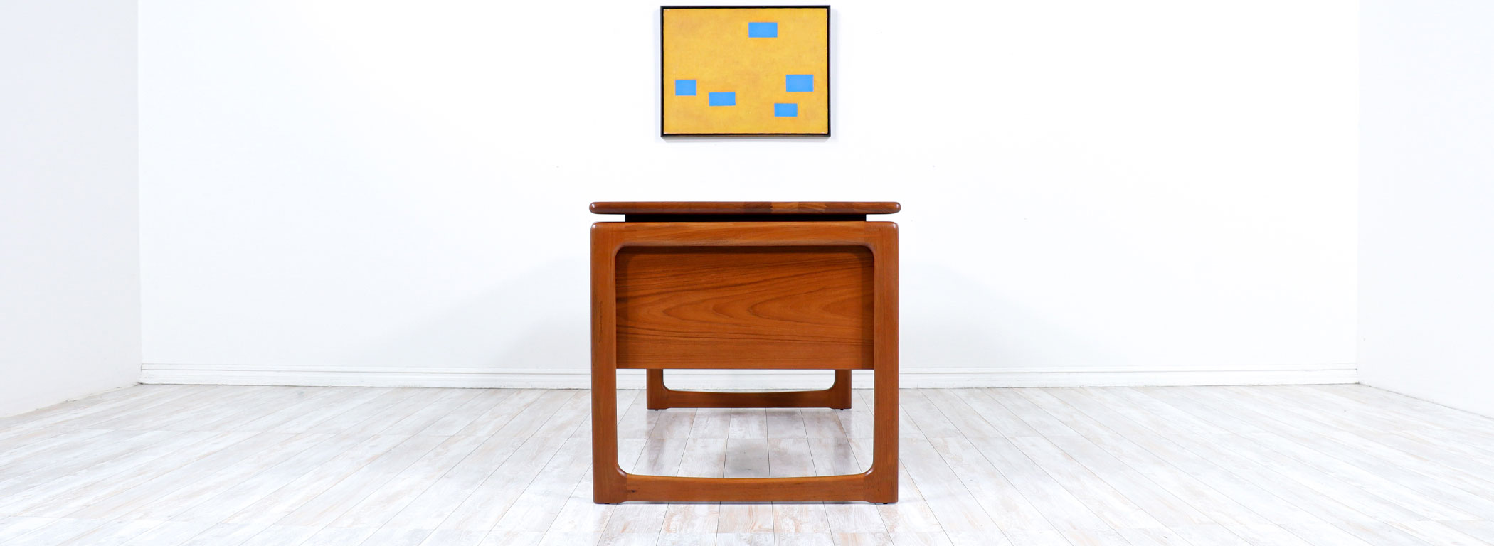 Stylish modern executive desk designed and manufactured in Denmark by Dyrlund circa 1960s. This striking Danish Modern design features a teak wood frame with three spacious drawers on its left side and filing drawer on its right side. Additionally it features an open back with two ample compartments for additional storage options. The top appears to float over the sled styled base creating a uniquely modern and lightweight aesthetic. The desk has been newly refinished by our expert craftsmen who ensured the visibility of the intricate teak grain. This desk would be an excellent addition to any home or office, giving you the perfect workspace while exuding elegance.