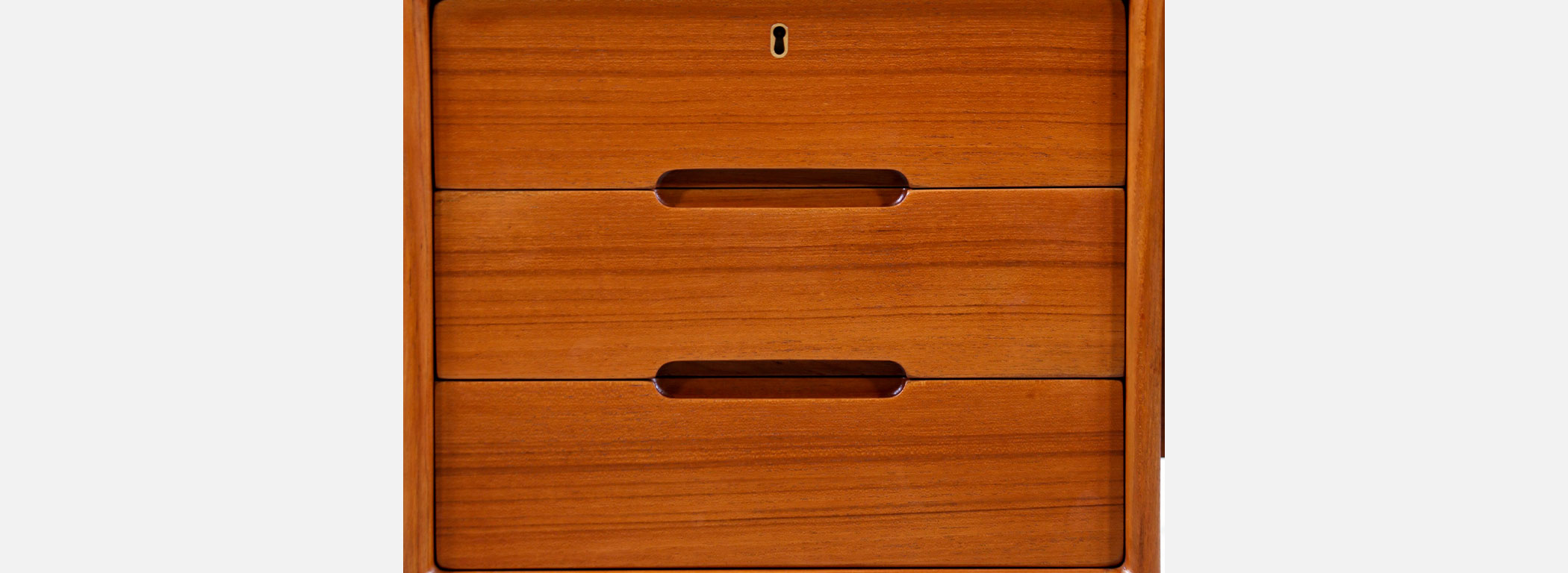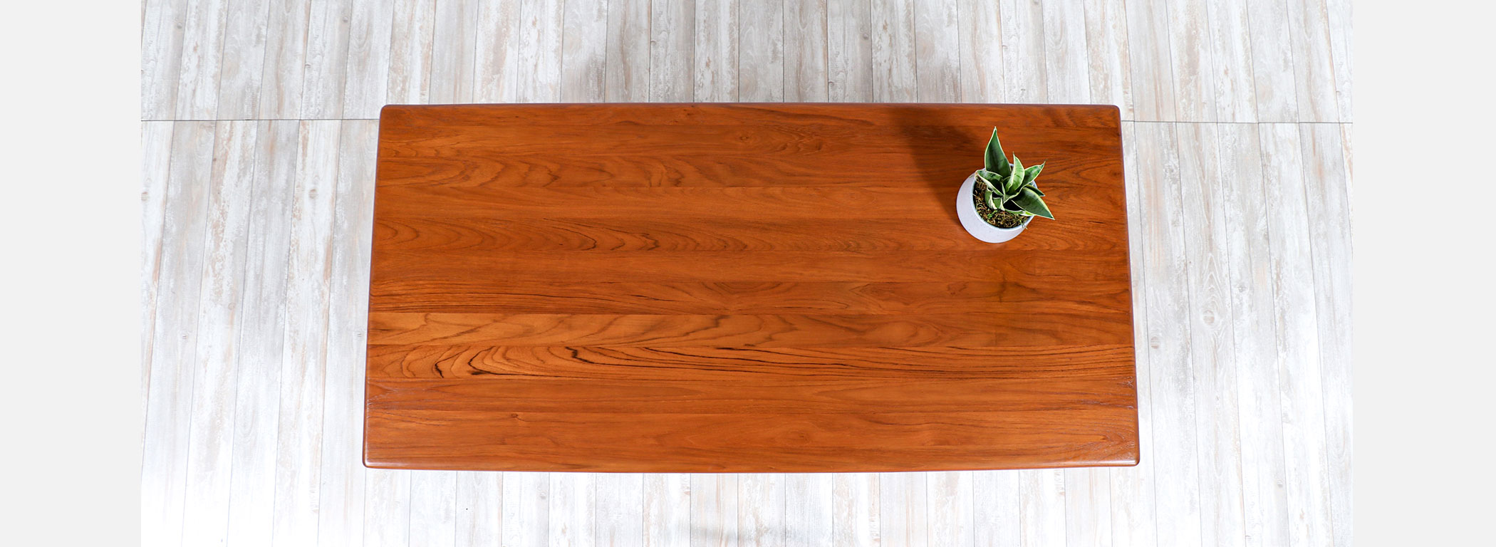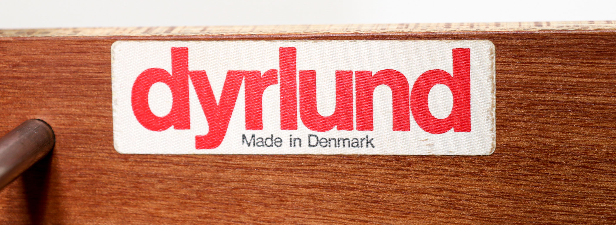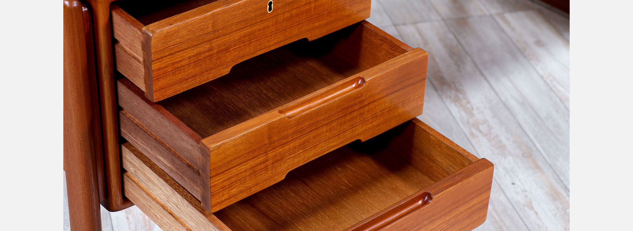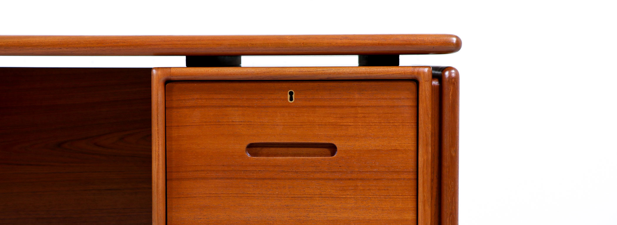 Stylish modern executive desk designed and manufactured in Denmark by Dyrlund circa 1960s. This striking Danish Modern design features a teak wood frame with three spacious drawers on its left side and filing drawer on its right side. Additionally it features an open back with two ample compartments for additional storage options. The top appears to float over the sled styled base creating a uniquely modern and lightweight aesthetic. The desk has been newly refinished by our expert craftsmen who ensured the visibility of the intricate teak grain. This desk would be an excellent addition to any home or office, giving you the perfect workspace while exuding elegance.