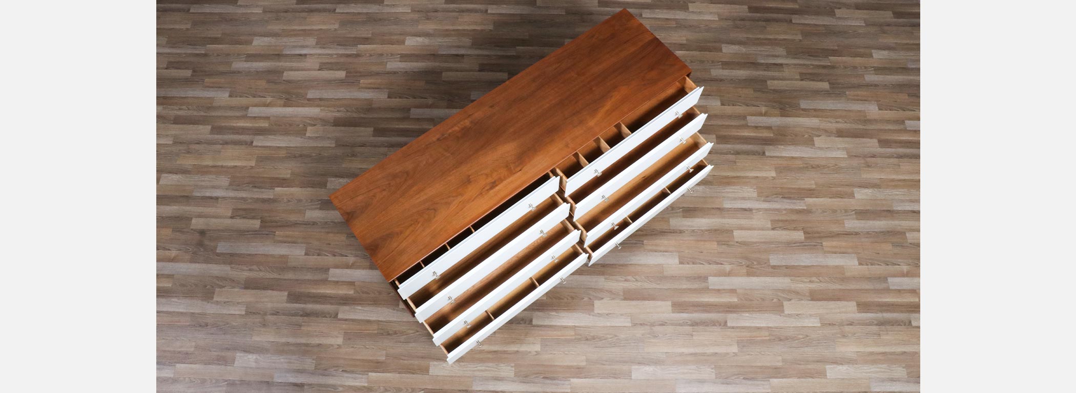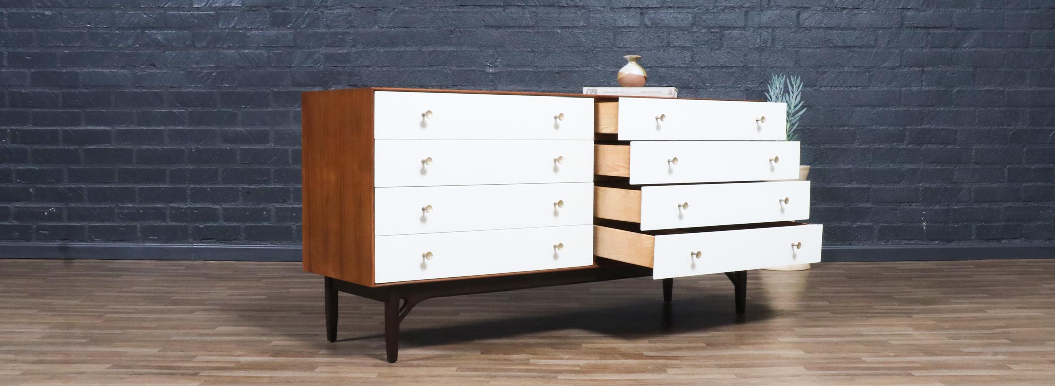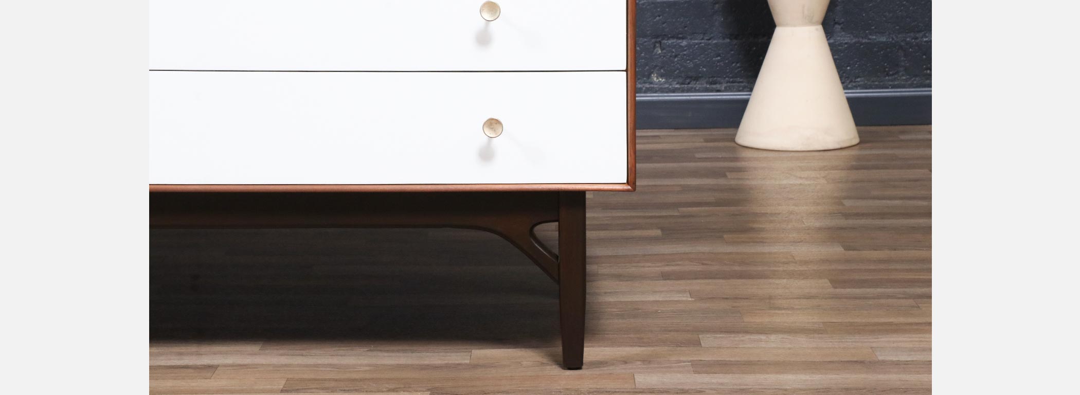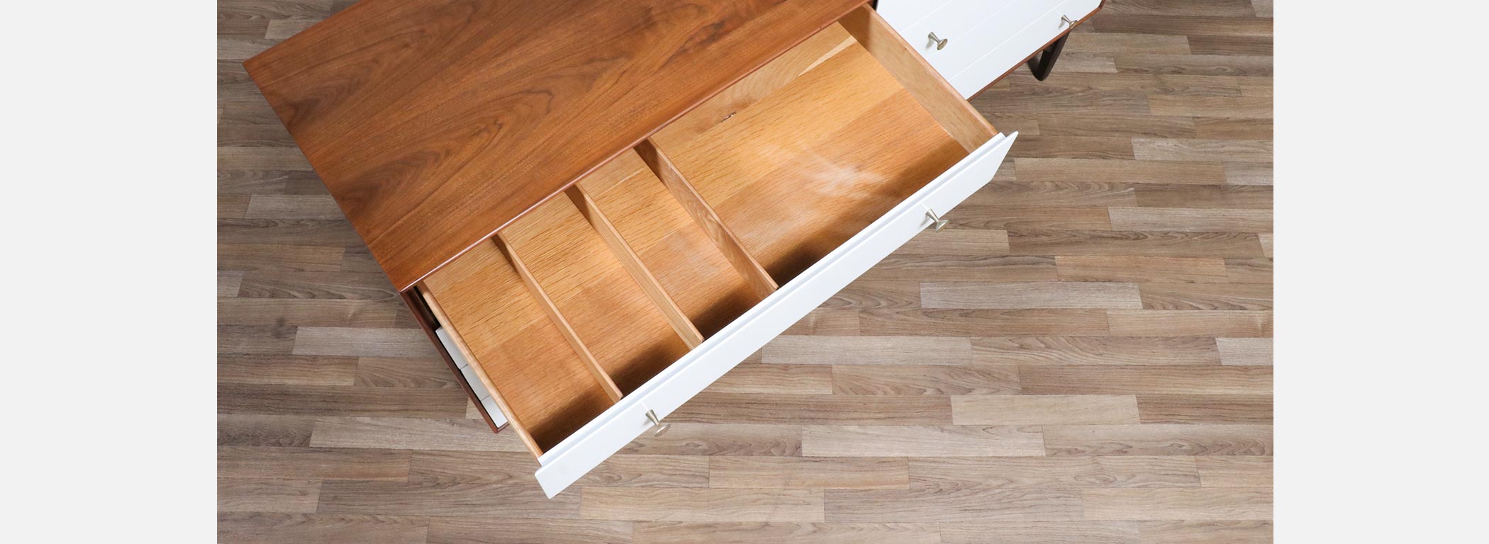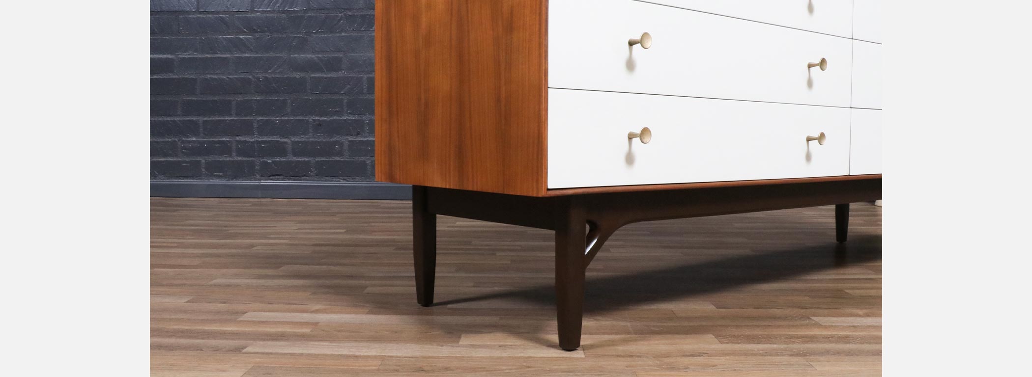 Walnut Wood, Satin-Lacquered Wood, Brass Pulls, Bentwood Legs