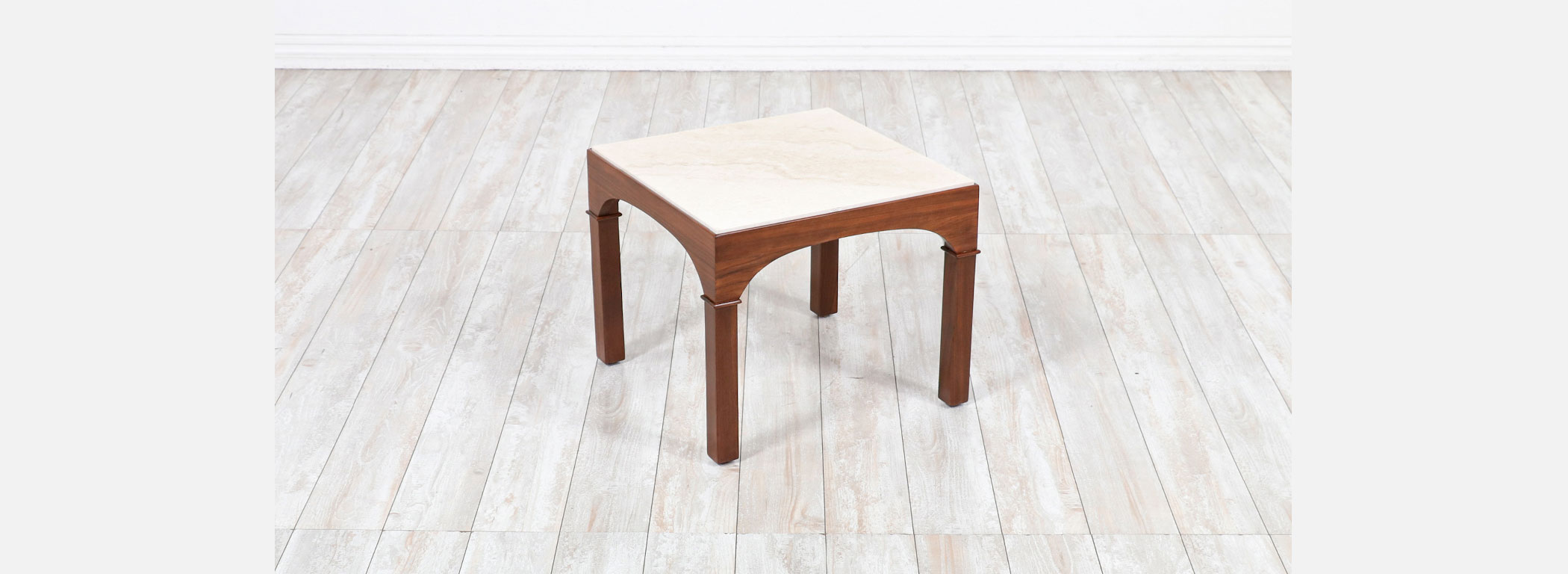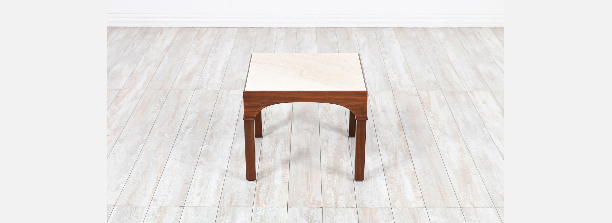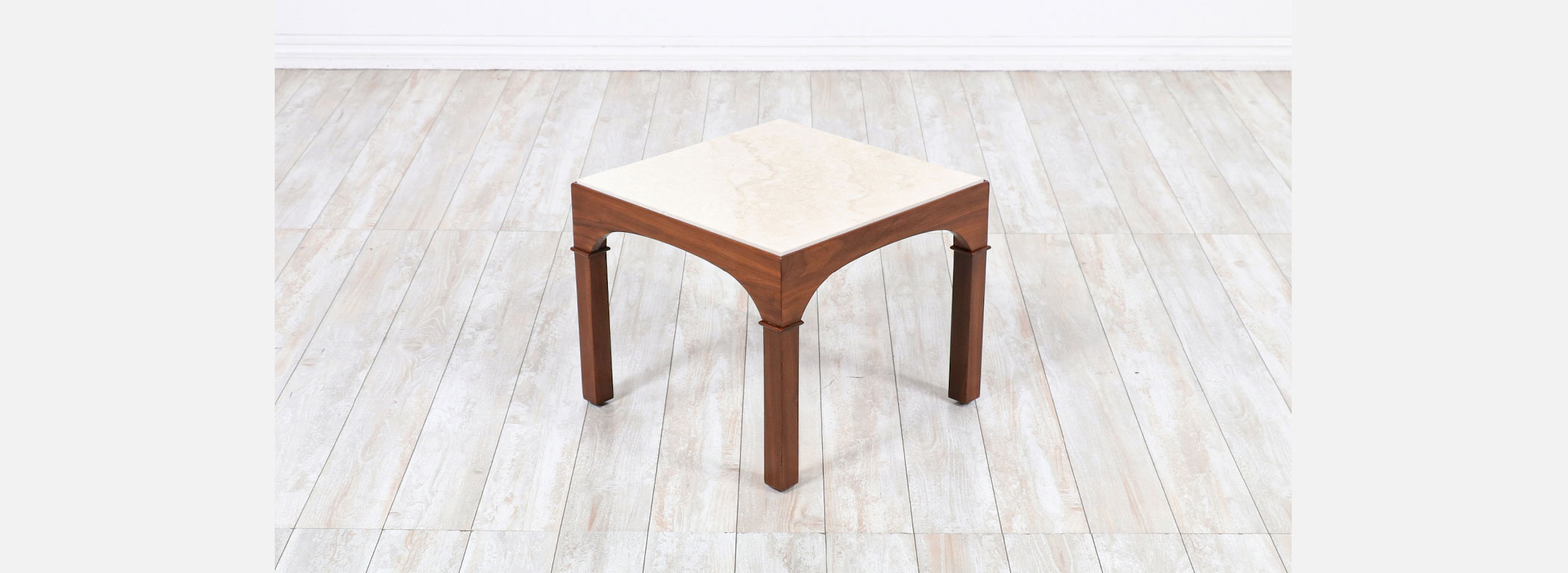 Stylish side table designed by John Keal and manufactured by Brown Saltman in the United States circa 1950’s. This unique design has been recently refinished by our skilled team of craftsmen in Los Angeles workshop and features its original travertine top in mint condition supported by a walnut wood frame. The use of different geometric shapes, including the arc-like design in between the rectangular legs with the use of different materials - wood and travertine - makes this piece a wonderful addition to any space.