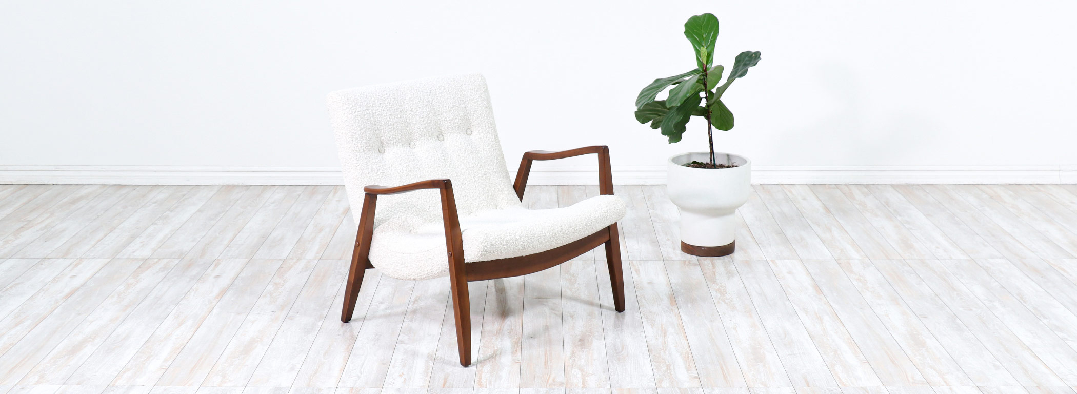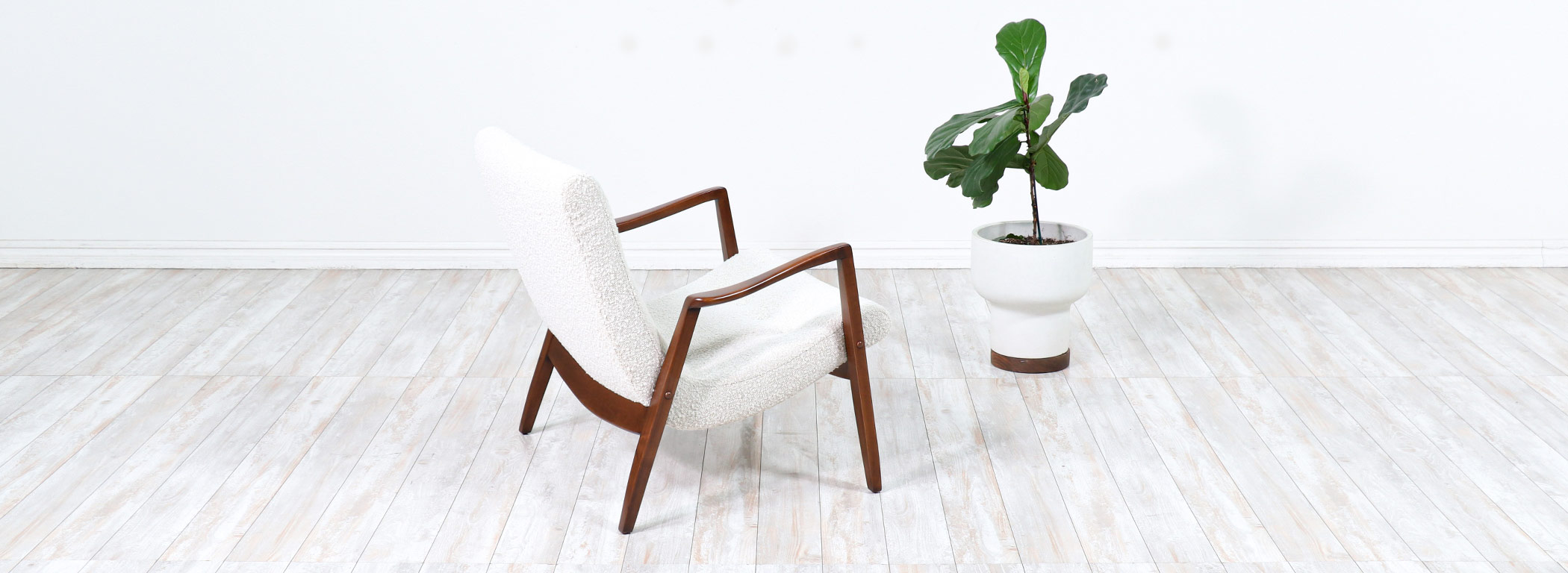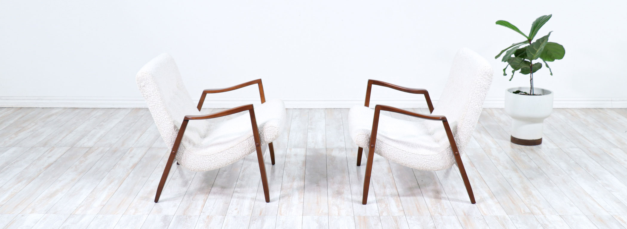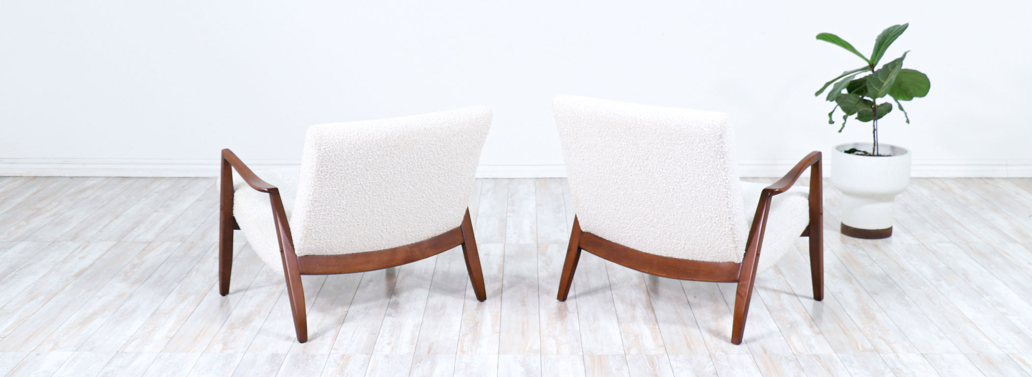 Pair of stylish ‘Scoop’ Lounge chair designed by Milo Baughman in the United States for James Inc. circa 1950s. These rare lounge chairs features an angled sculpted walnut wood frame with wide wood stretchers that hold the ‘scooped’ seat that appears to float in between the armrests. These sleek designs has been newly upholstered in an elegant white boucle wool with button-tufted details that add a touch of modern charm to this vintage chair. The mix of organic shapes and clean symmetry capture the essence of Mid-Century modern design and make of this chair the perfect addition to any home or office space. This item has been refinished by our experienced craftsmen, remaining true to the original design and aesthetic components intact.
