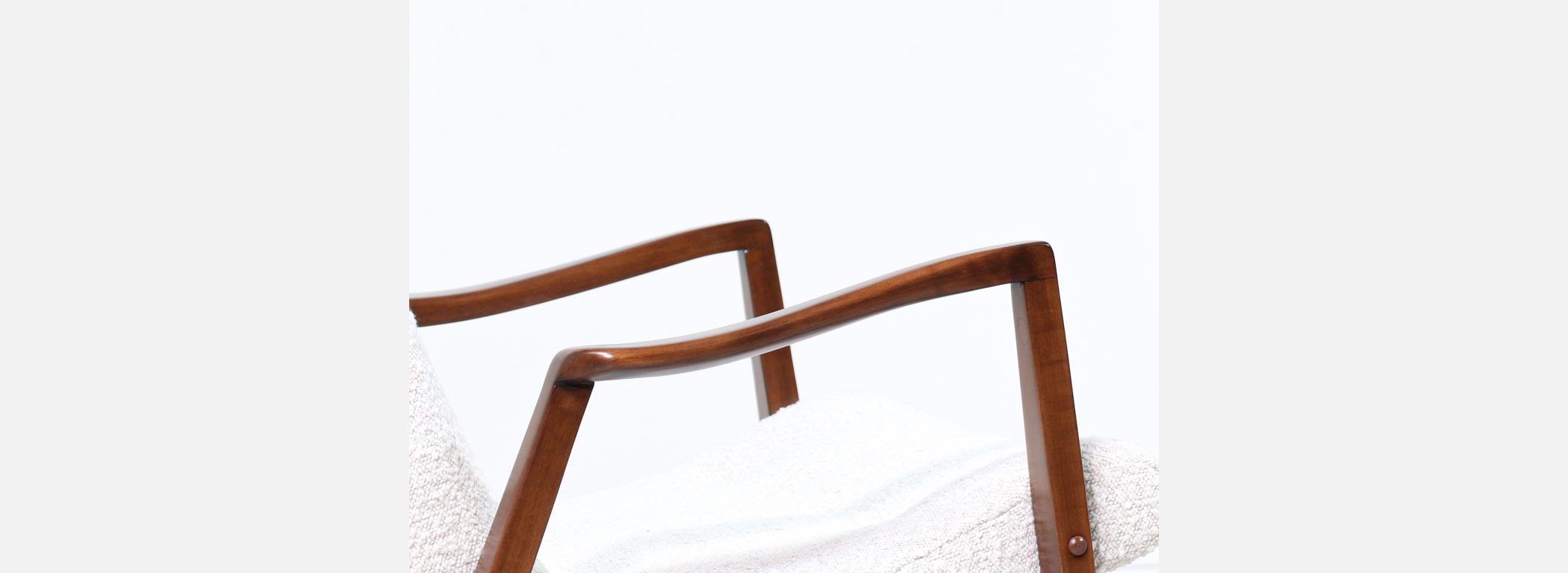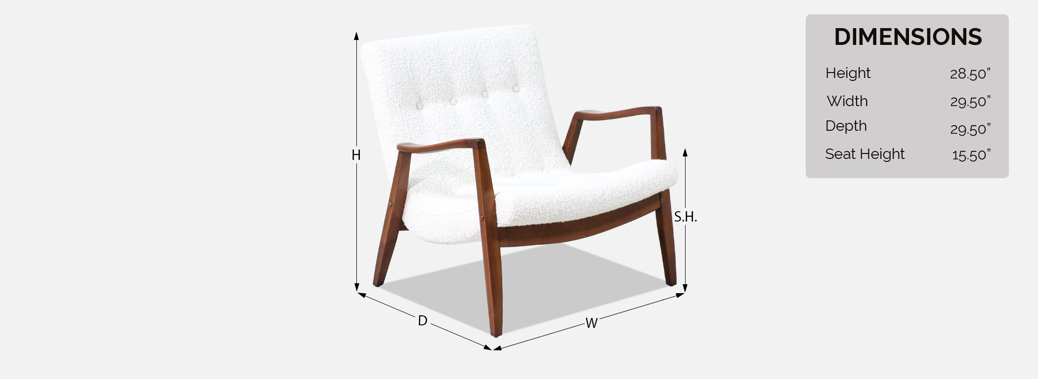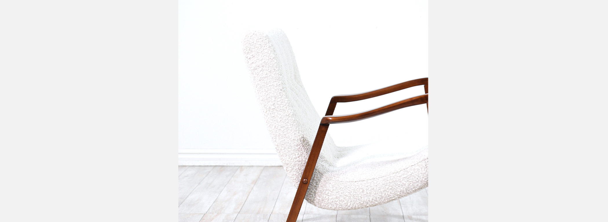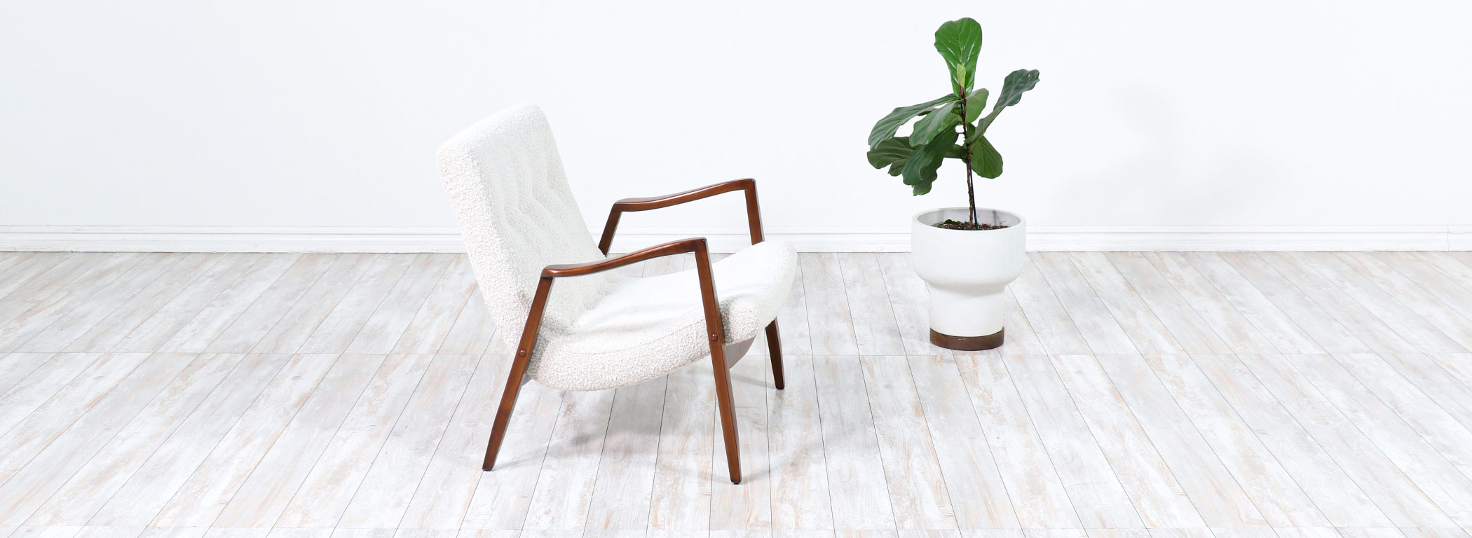 Pair of stylish ‘Scoop’ Lounge chair designed by Milo Baughman in the United States for James Inc. circa 1950s. These rare lounge chairs features an angled sculpted walnut wood frame with wide wood stretchers that hold the ‘scooped’ seat that appears to float in between the armrests. These sleek designs has been newly upholstered in an elegant white boucle wool with button-tufted details that add a touch of modern charm to this vintage chair. The mix of organic shapes and clean symmetry capture the essence of Mid-Century modern design and make of this chair the perfect addition to any home or office space. This item has been refinished by our experienced craftsmen, remaining true to the original design and aesthetic components intact.