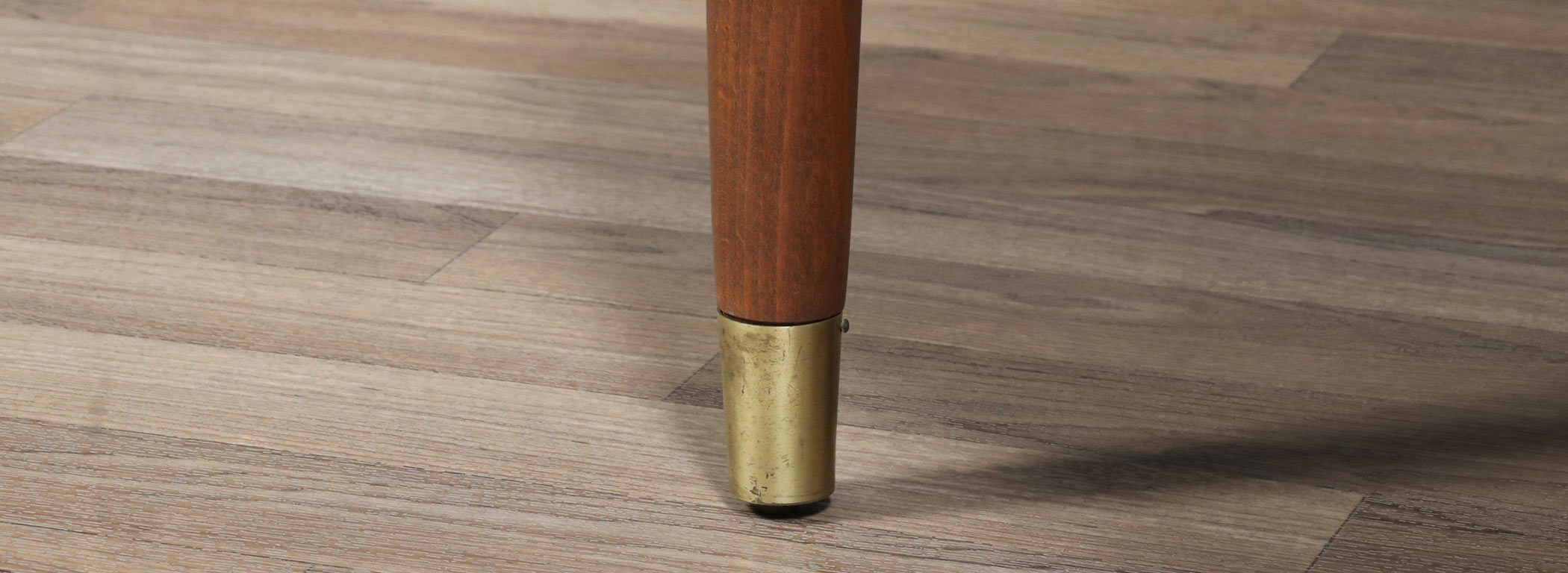 Walnut-Stained Beechwood, New Tweed Fabric, Brass Sabots, Leather Buttons, New Webbing, New High Density Foam